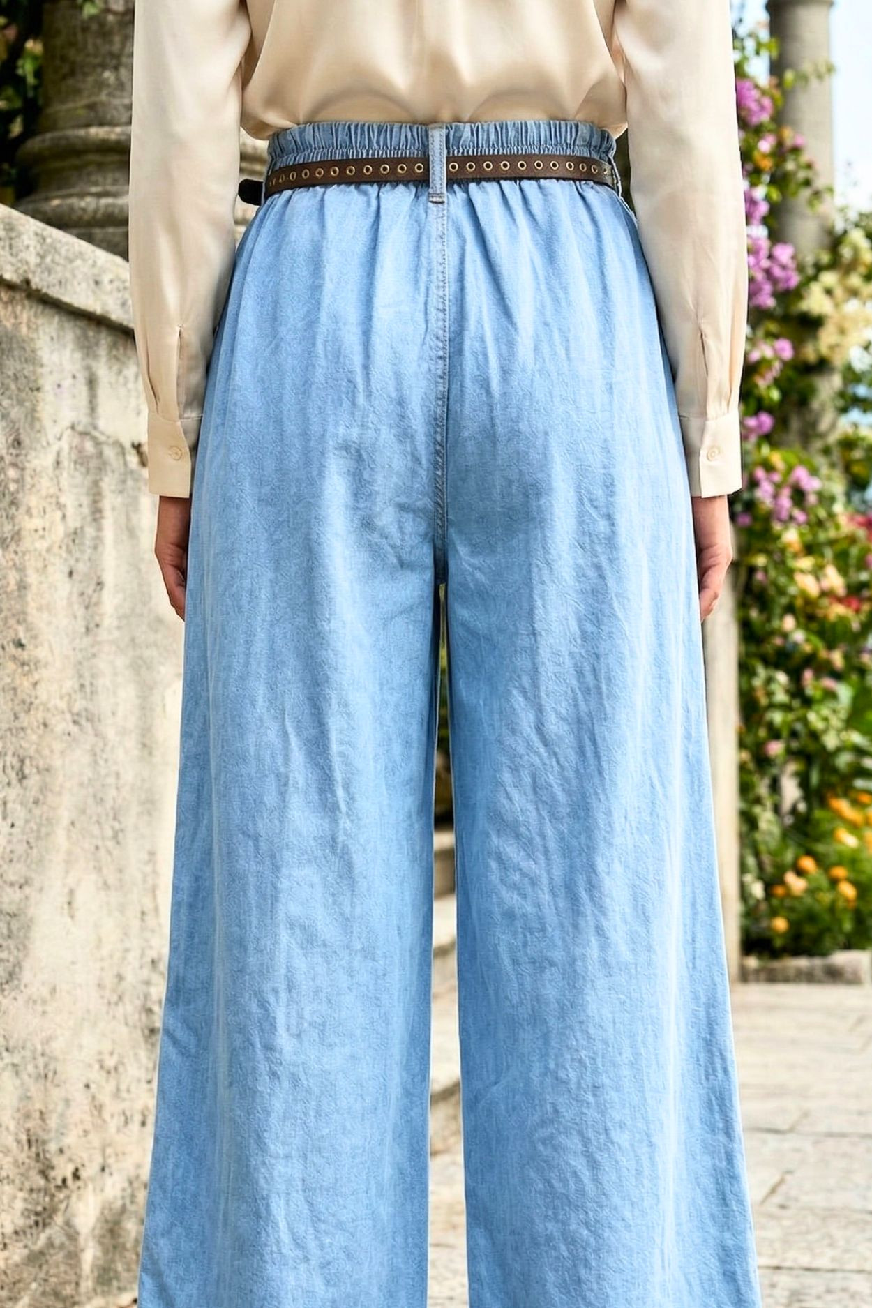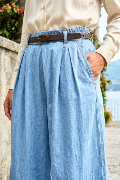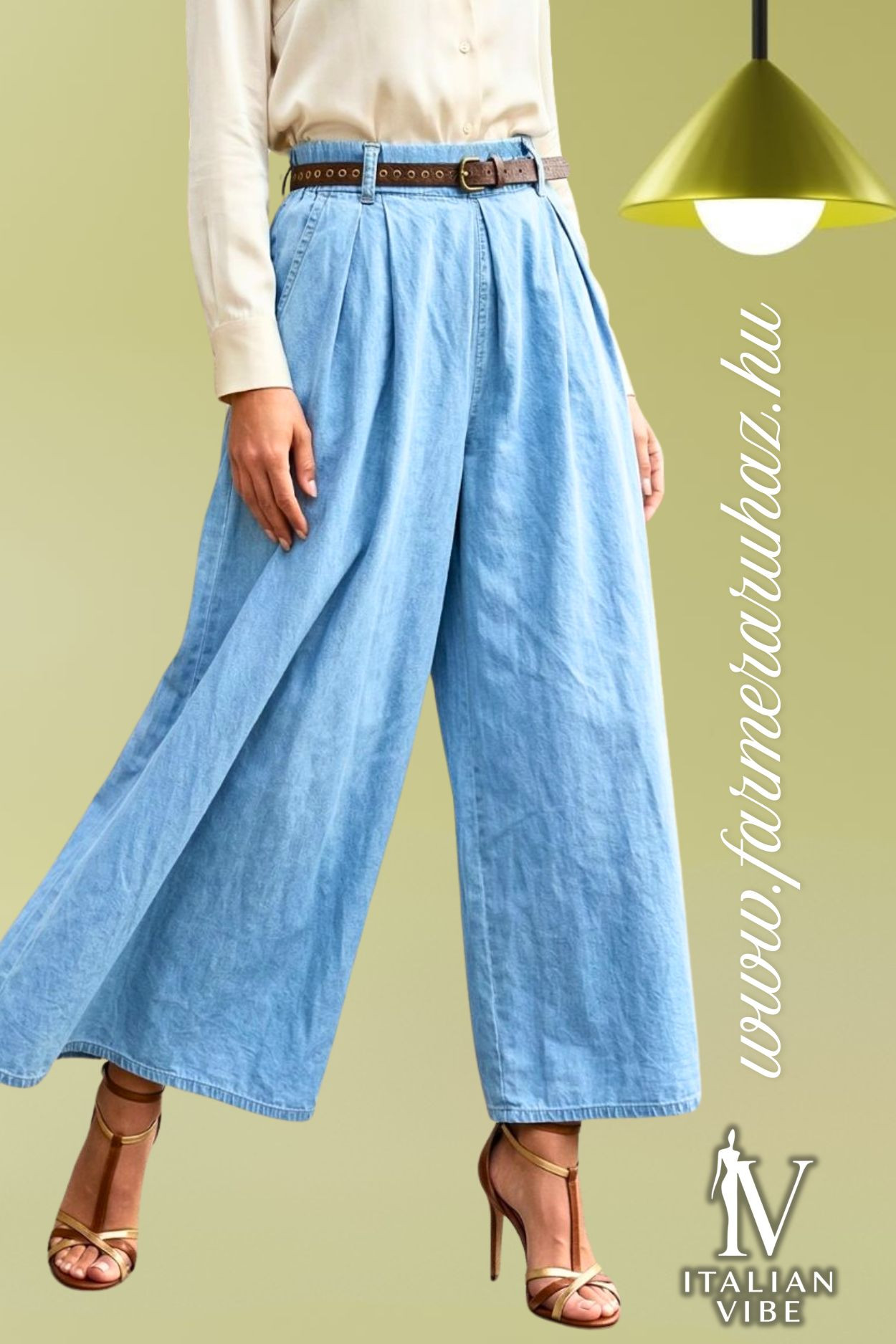Italian Vibe női farmer hatású palazzo nadrág, világoskék színben. Hátul gumis dereka övbújtatós, hajtásokkal formált. Oldalzsebes, hozzá tartozó bőrhatású övvel.