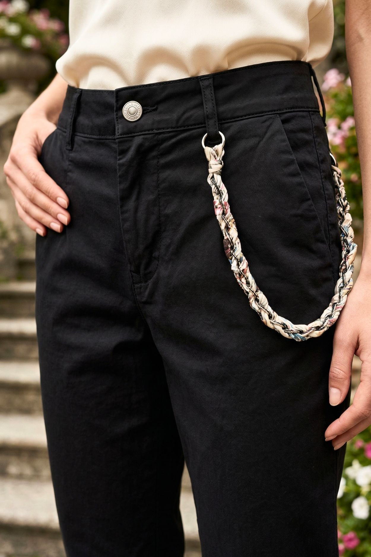 Italian Vibe MOM jeans fazonú női nadrág, fekete színben. Dereka gombos és övbújtatós, slicc része cipzáras, oldal és dísz farzsebes. Oldalán levehető kendővel átfűzött láncos díszítéssel.