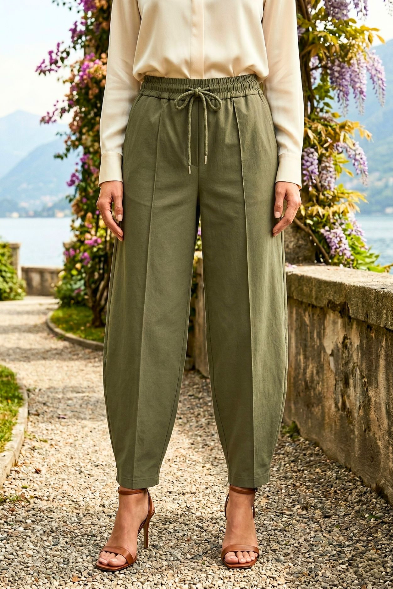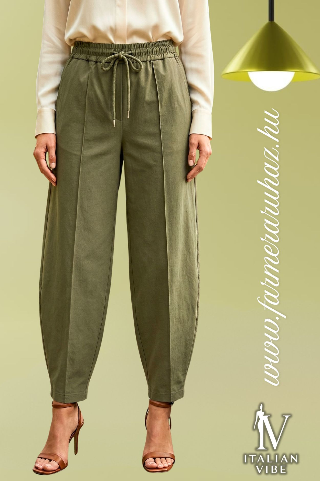 Italian Vibe - Barrel Fit - fazonú női elasztikus vászon nadrág, khaky színben. Dereka gumis és megkötős. Elején élvarrott, oldalzsebes.