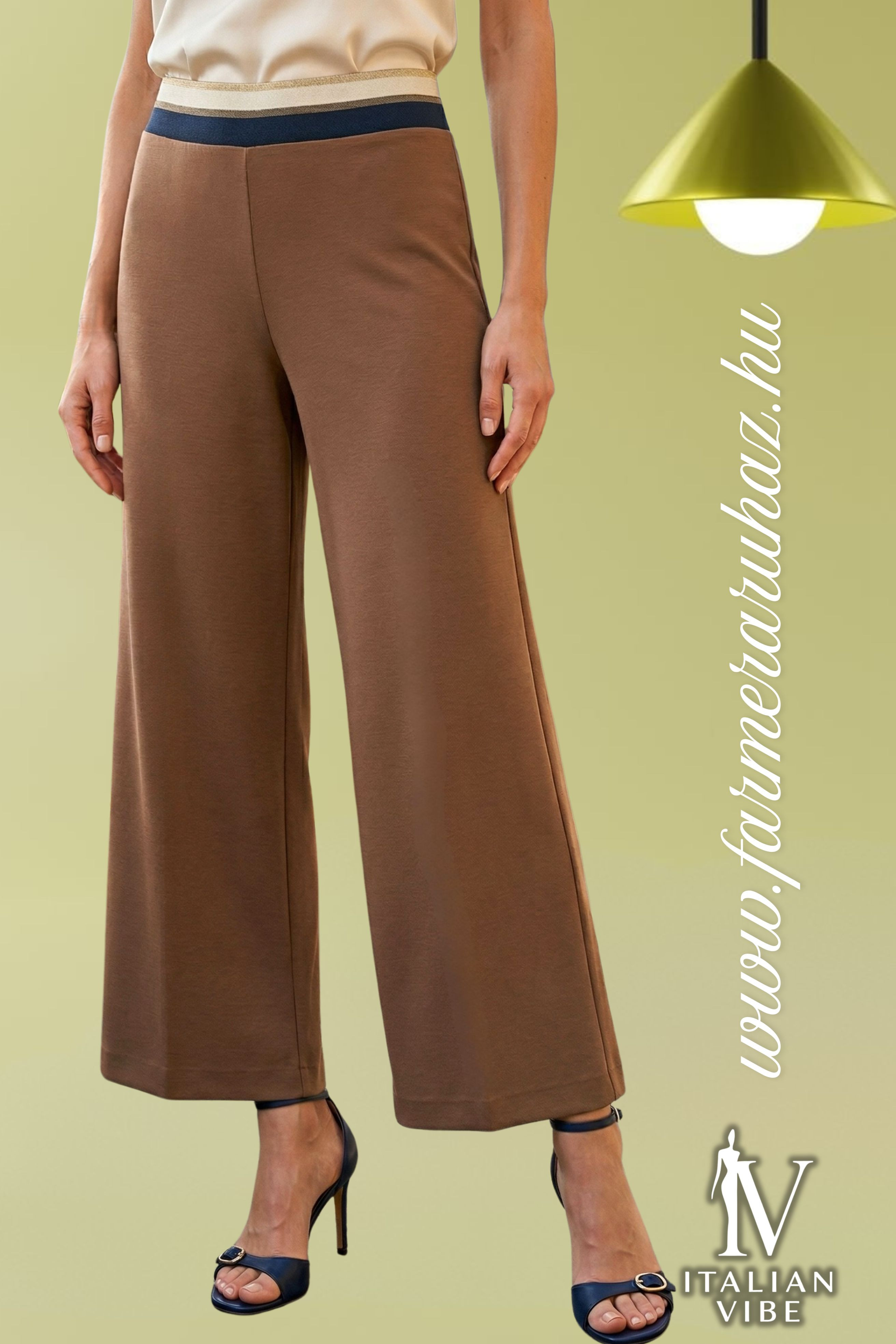 Italian Vibe laza fazonú női nadrág, barna színben, bő szárral, gumis derekán elöl bordás lurexálas passéval