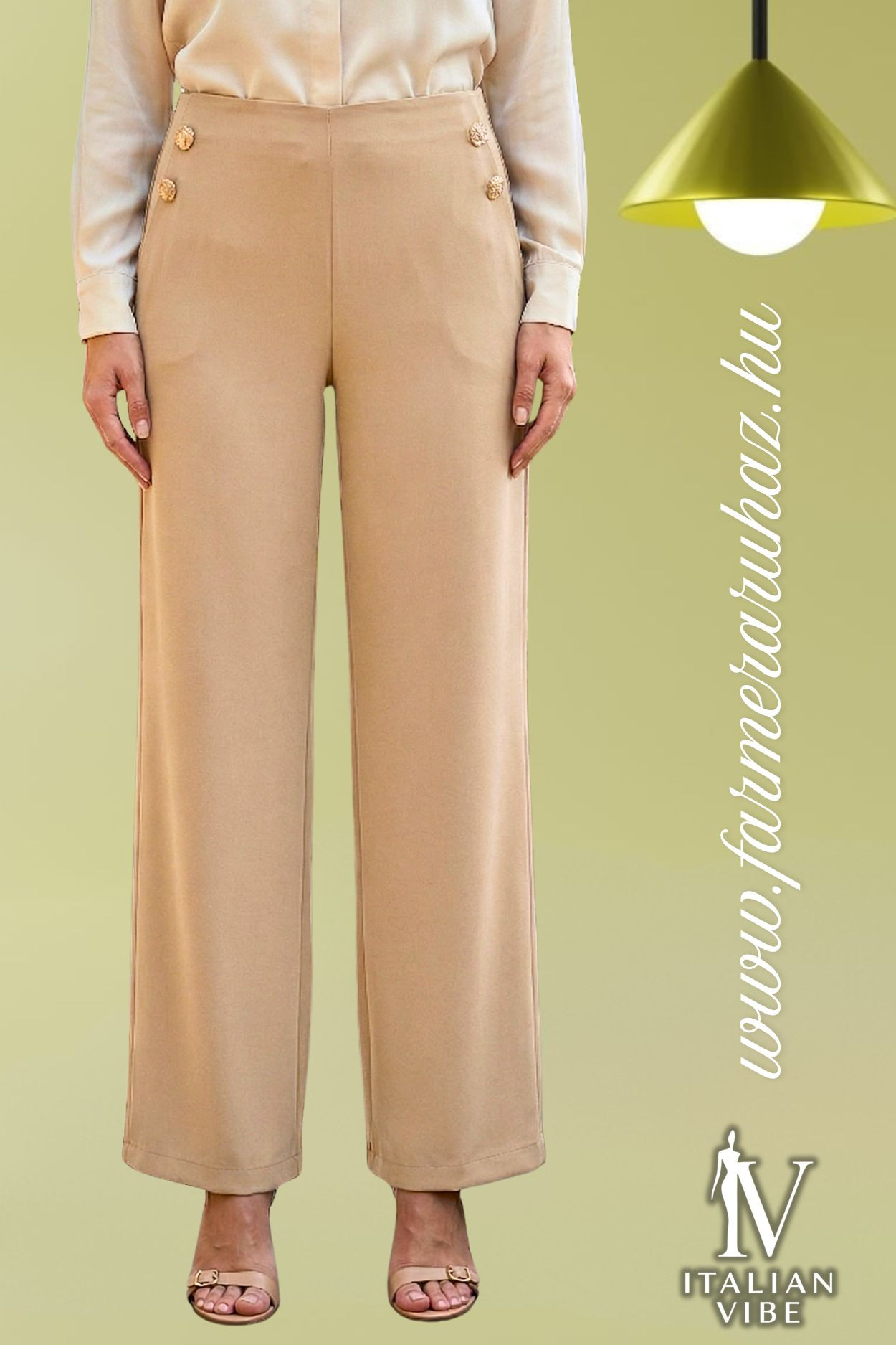 Italian Vibe elegáns női nadrág, bézs színben, bő szárral, hátul gumis derekkal, elején dísz gombokkal és oldalzsebekkel.