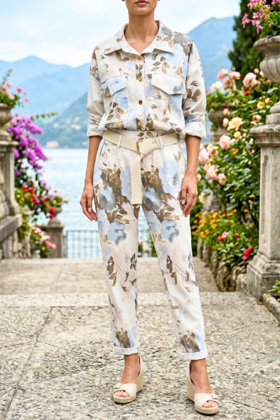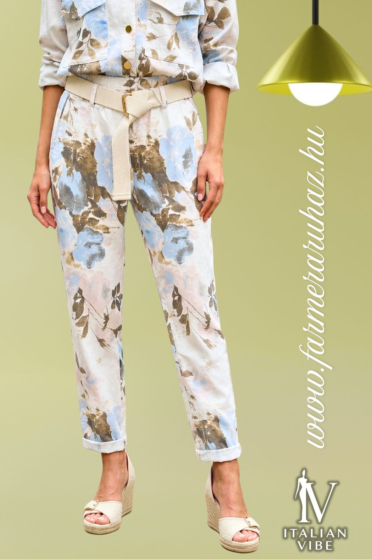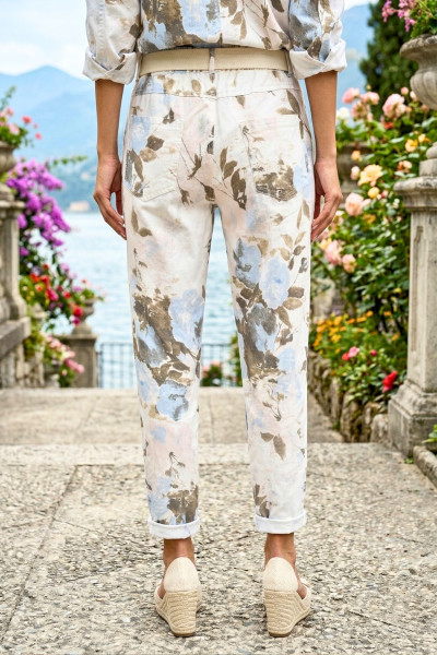 Italian Vibe - Tapered - fazonú női elasztikus vászon nadrág, ekrü színben, virág mintával. Gumis dereka övbújtatós, hozzá tartozó textil övvel, oldal és farzsebes.