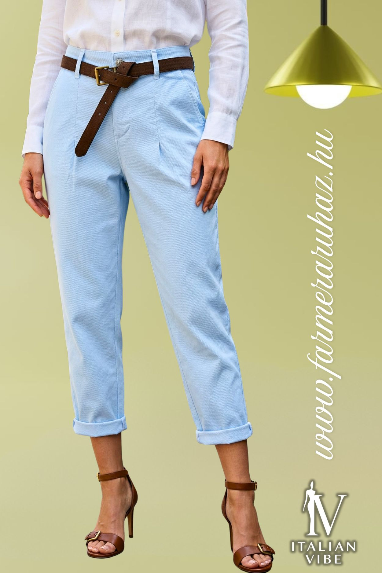 Italian Vibe MOM jeans fazonú női texturált anyagú nadrág, világoskék színben. Dereka gombos és övbújtatós, hozzá tartozó bőrhatású övvel, slicc része cipzáras, oldal és dísz farzsebes.