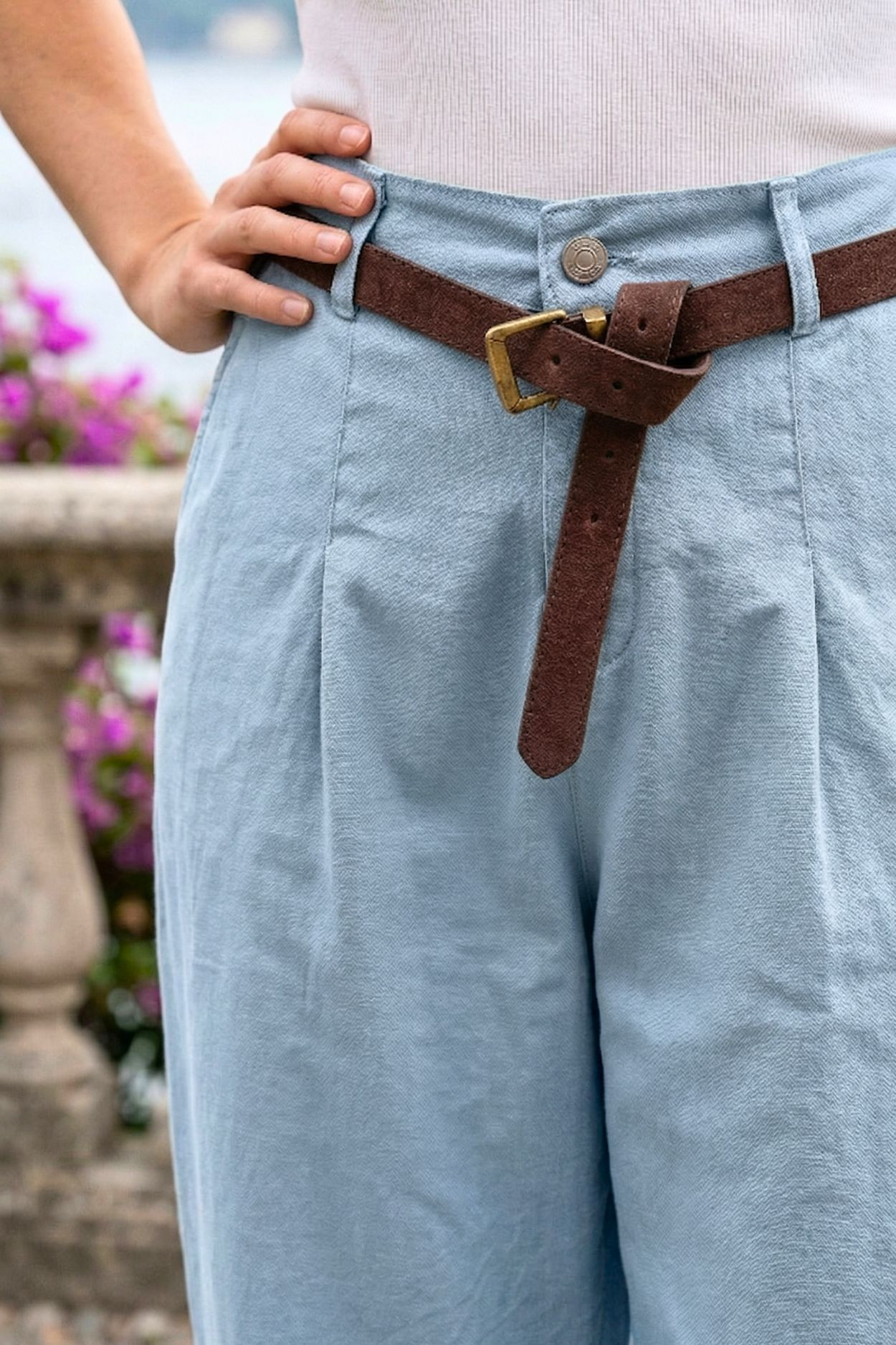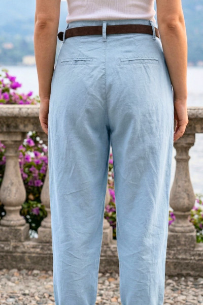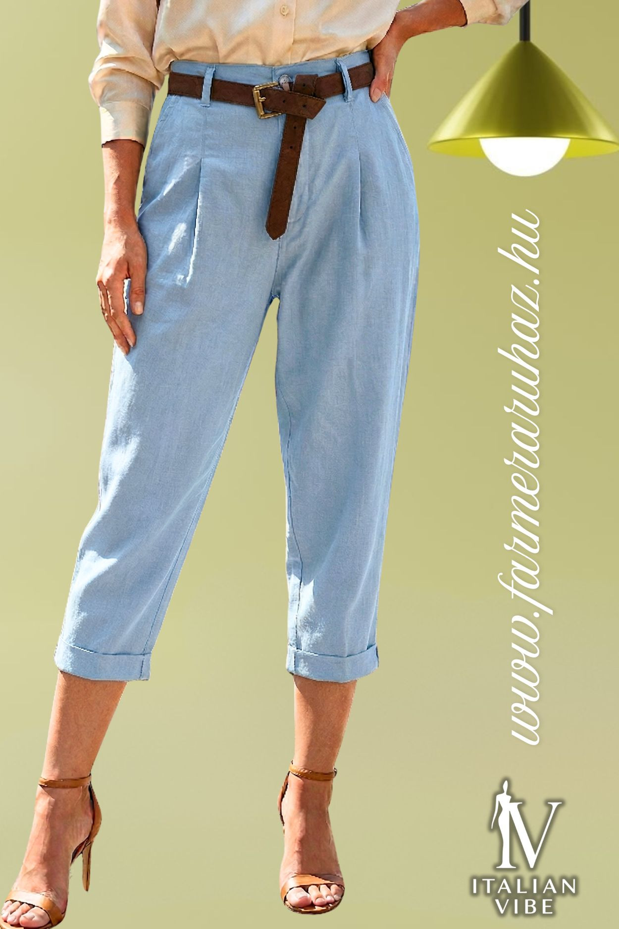 Italian Vibe MOM jeans fazonú női texturált anyagú nadrág, világoskék színben. Dereka gombos és övbújtatós, hozzá tartozó bőrhatású övvel, slicc része cipzáras, oldal és dísz farzsebes.