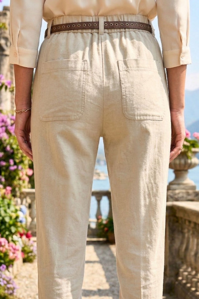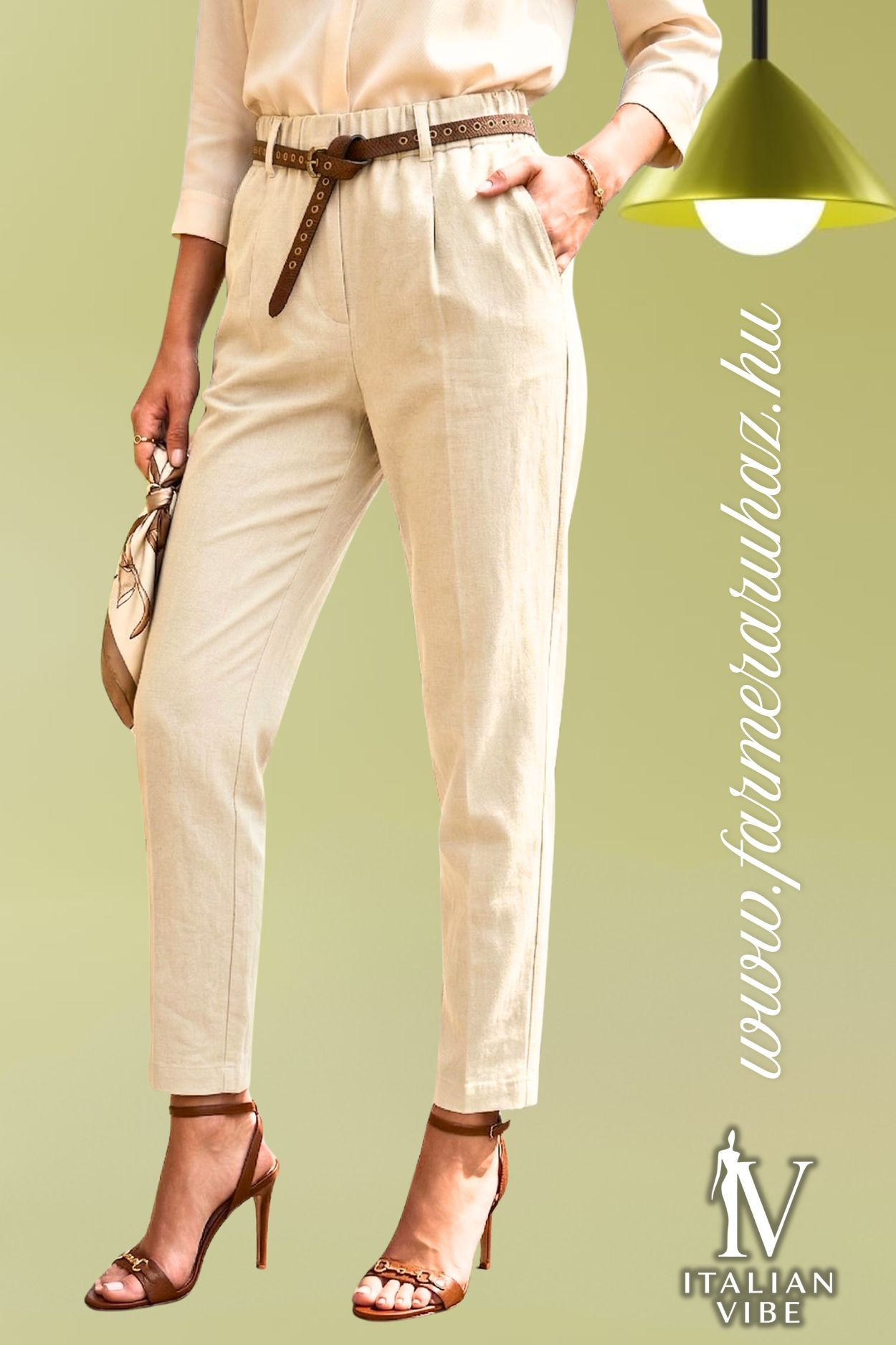 Italian Vibe MOM jeans fazonú női elasztikus vászon nadrág, bézs színben. Gumis dereka övbújtatós, hozzá tartozó bőrhatású övvel, oldal és farzsebes.