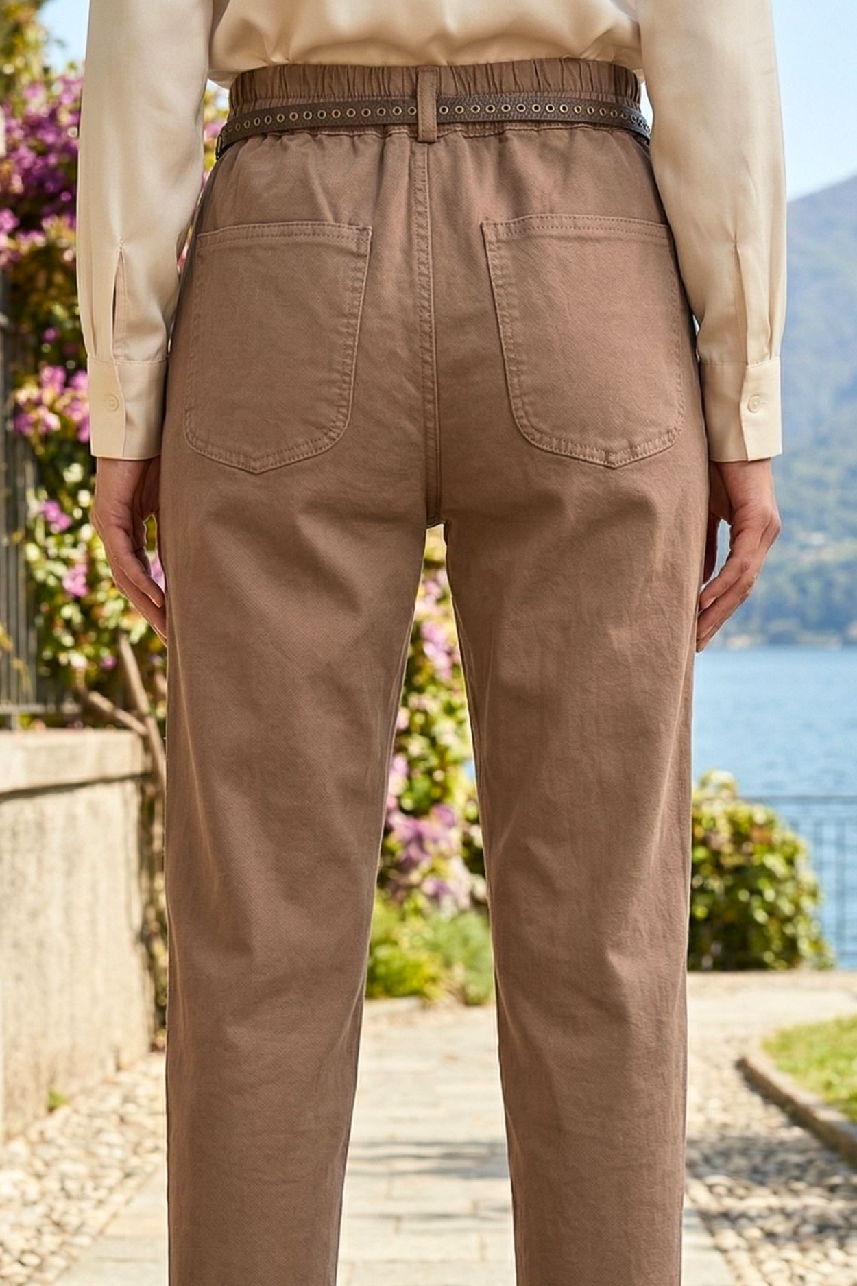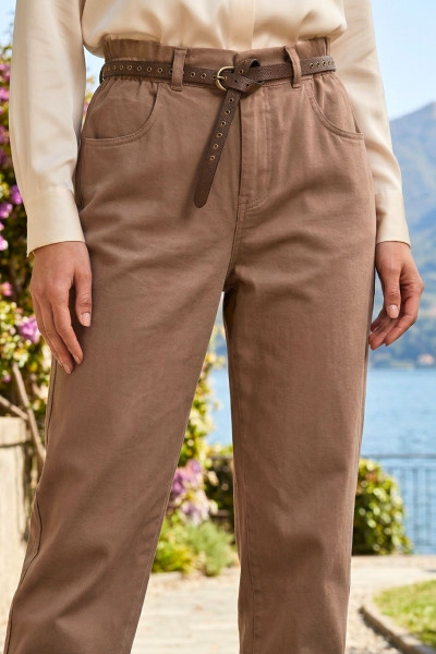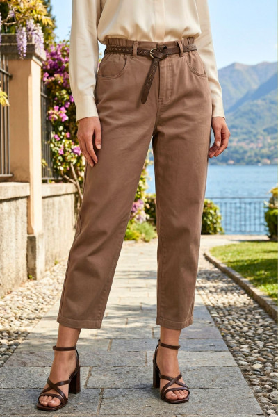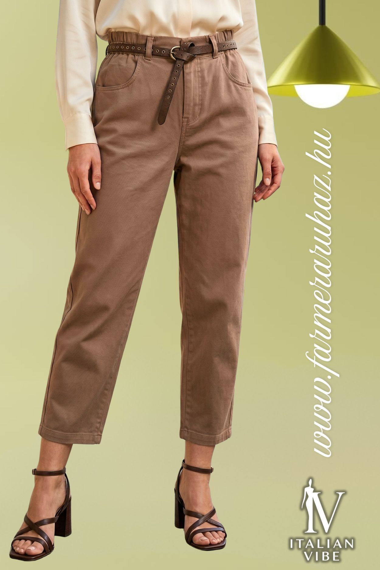 Italian Vibe - Barrel Fit - fazonú női elasztikus vászon nadrág, barna színben. Dereka övbújtatós, elöl gombos, hátul gumis, cipzáras sliccel. Hozzá tartozó bőrhatású övvel, oldal és farzsebes.