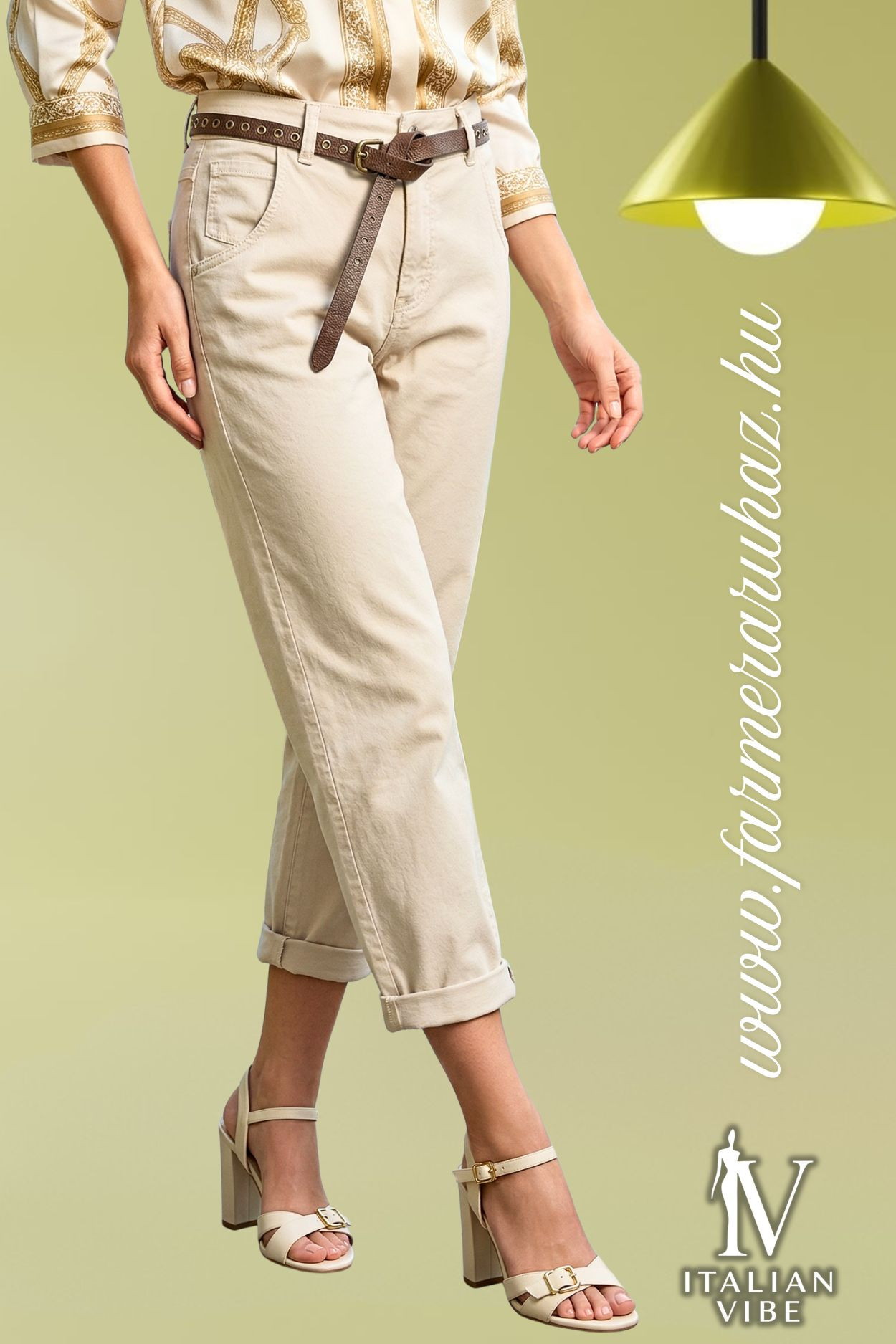Italian Vibe - Barrel Fit - fazonú női elasztikus vászon nadrág, gipsz színben. Dereka gombos és övbújtatós, slicce cipzáras. Hozzá tartozó bőrhatású övvel, oldal és farzsebes.