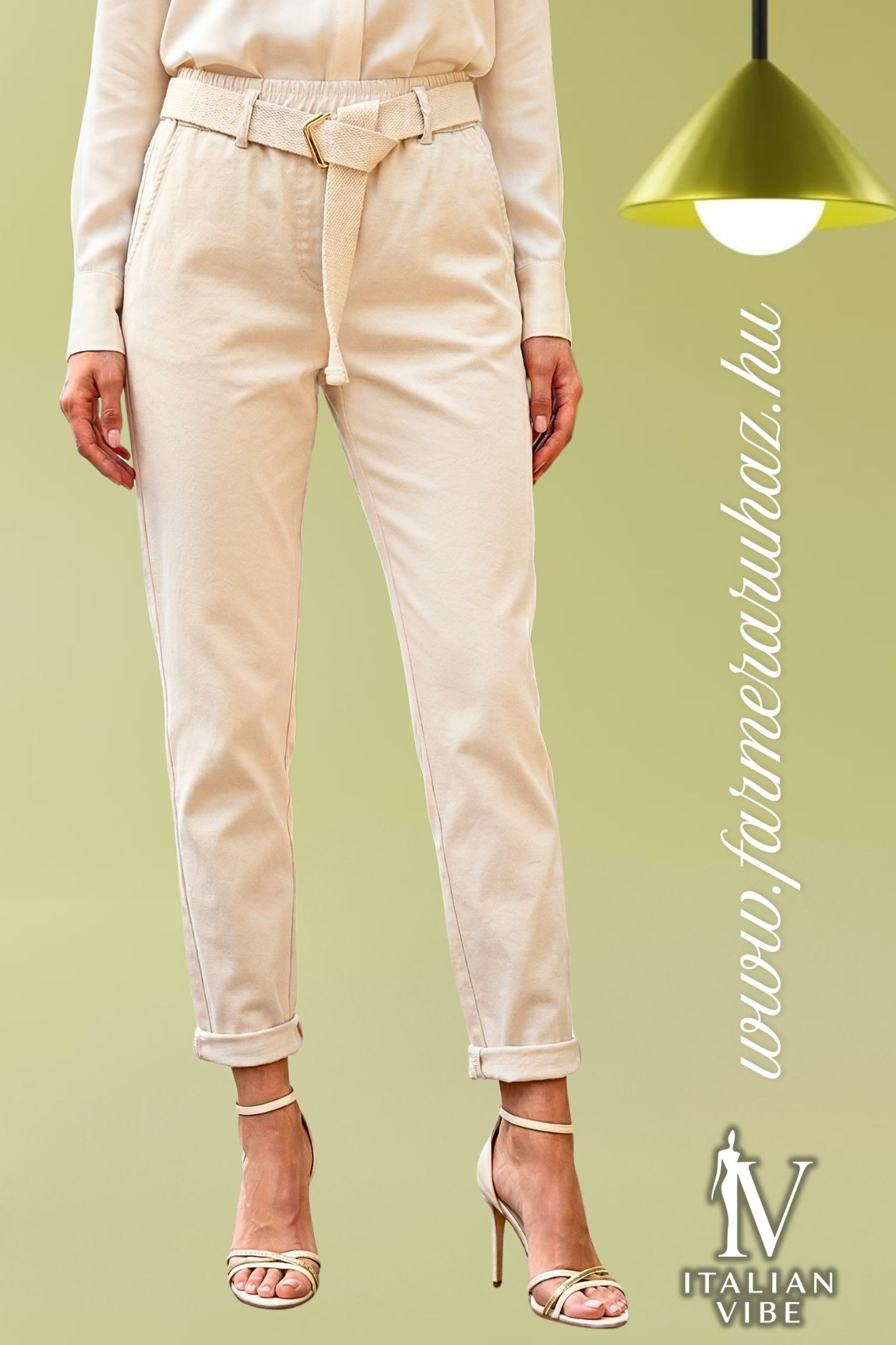 Italian Vibe - Tapered - fazonú női elasztikus vászon nadrág, natúr bézs színben. Gumis dereka övbújtatós, hozzá tartozó textil övvel, oldal és farzsebes.
