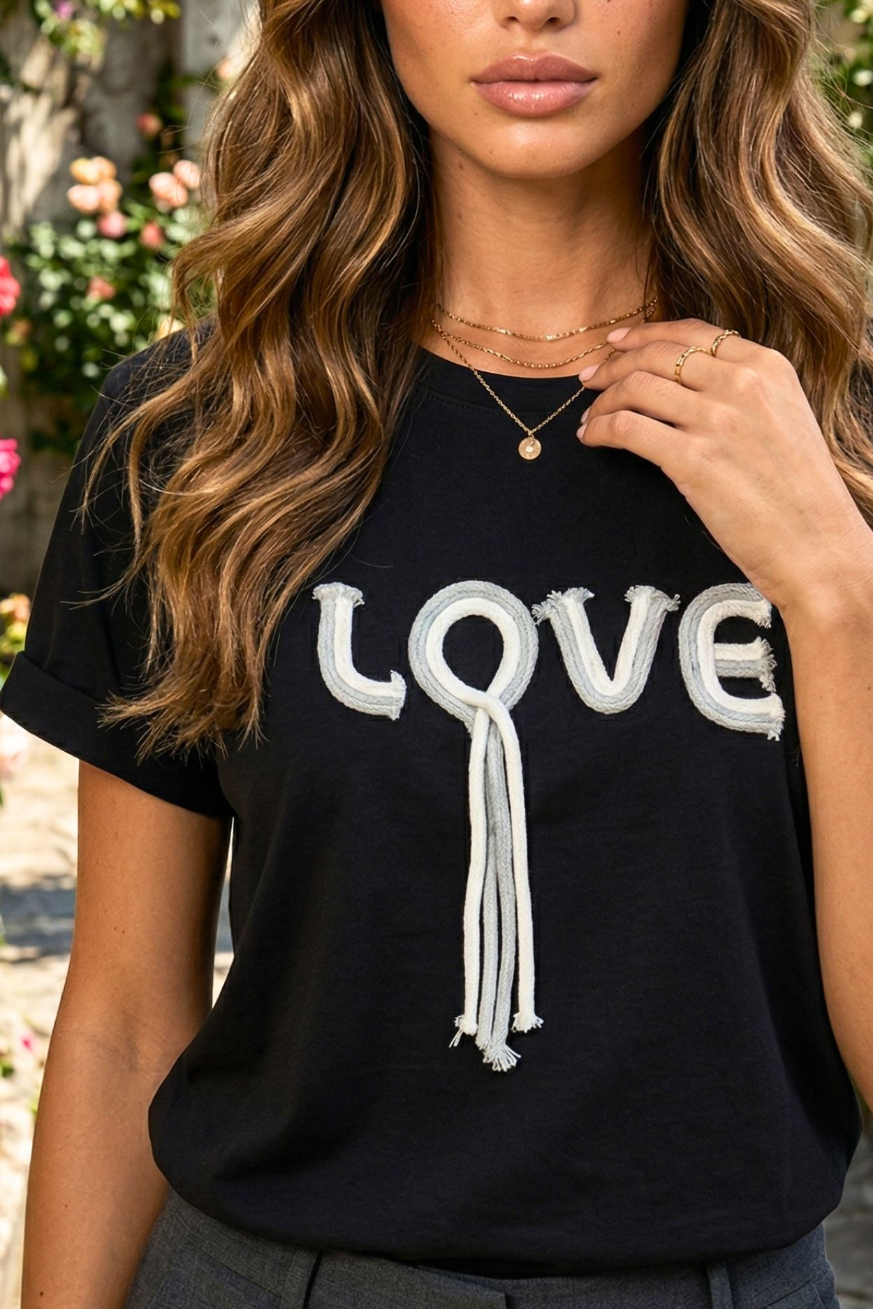 Italian Vibe lazább fazonú női póló, fekete színben. Visszahajtott ujjal, elején kötél felirattal.