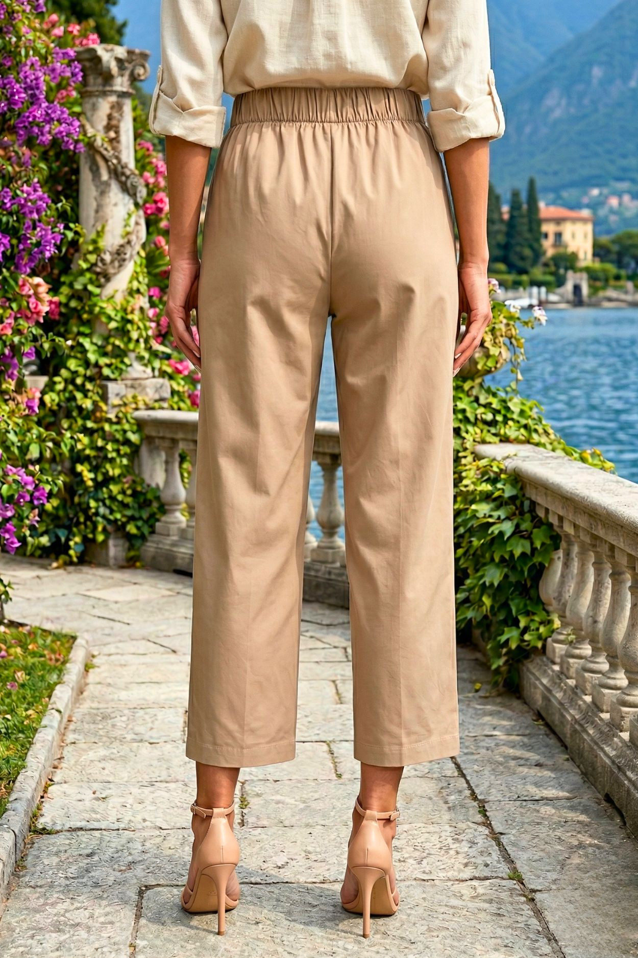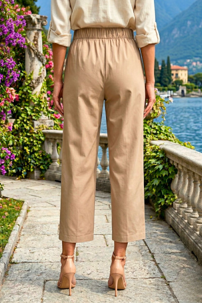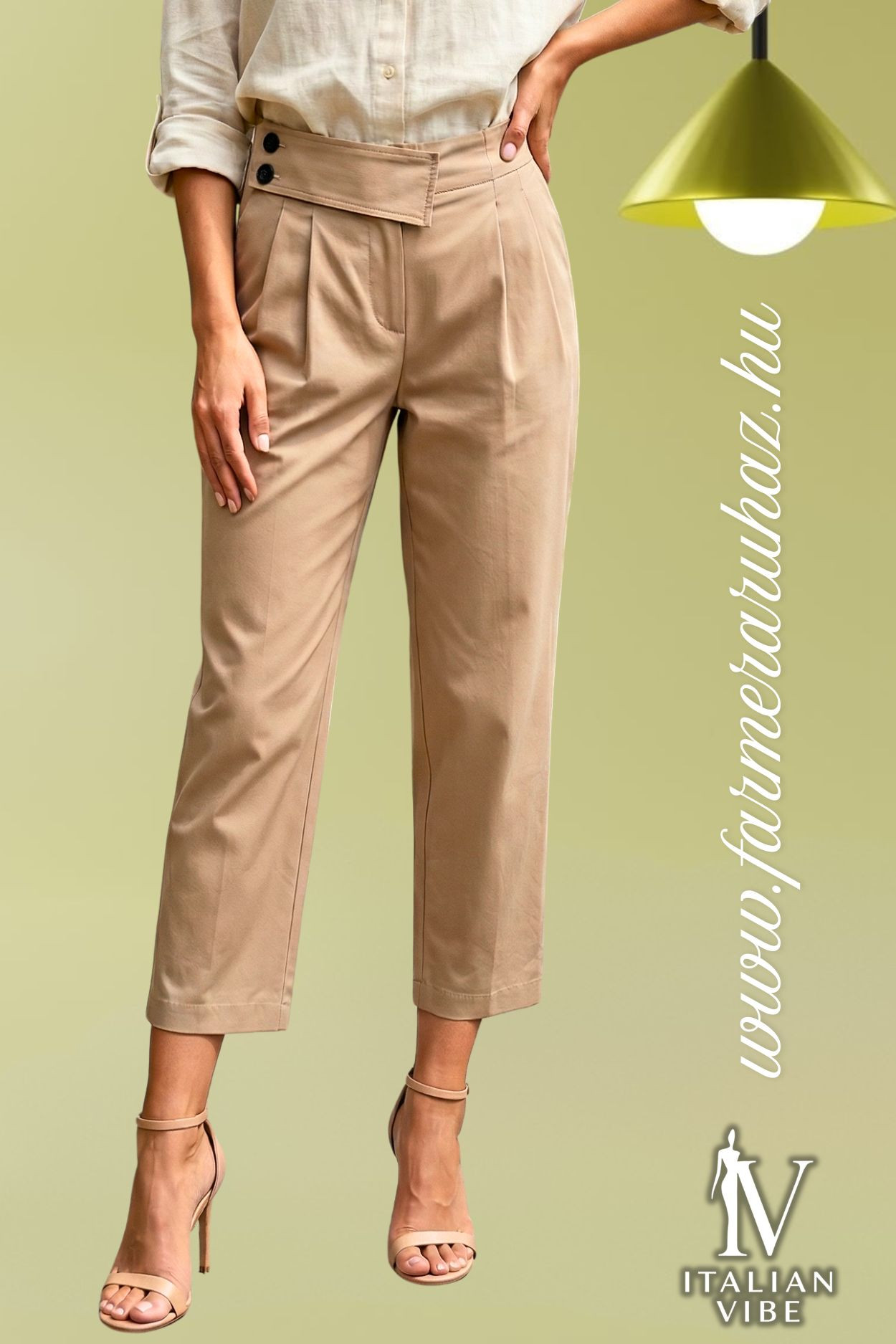 Italian Vibe elegáns nadrág, bézs színben. Laza szíbással és felhajtott szárral, Dereka hátul gumis, elején asszimetrikus dísz gombolással és díszítő hajtásokkal. Oldalzsebes.