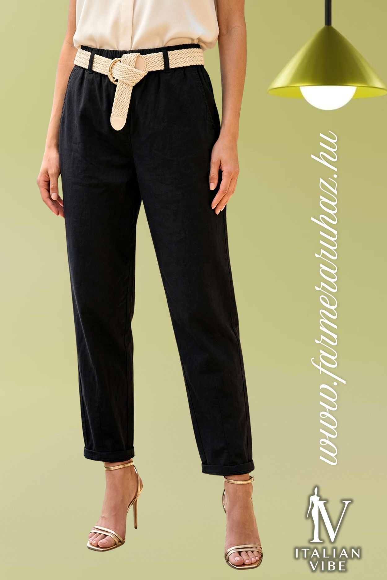 Italian Vibe - Tapered - fazonú női elasztikus vászon nadrág, fekete színben. Gumis dereka övbújtatós, hozzá tartozó fonott övvel, oldal és farzsebes.