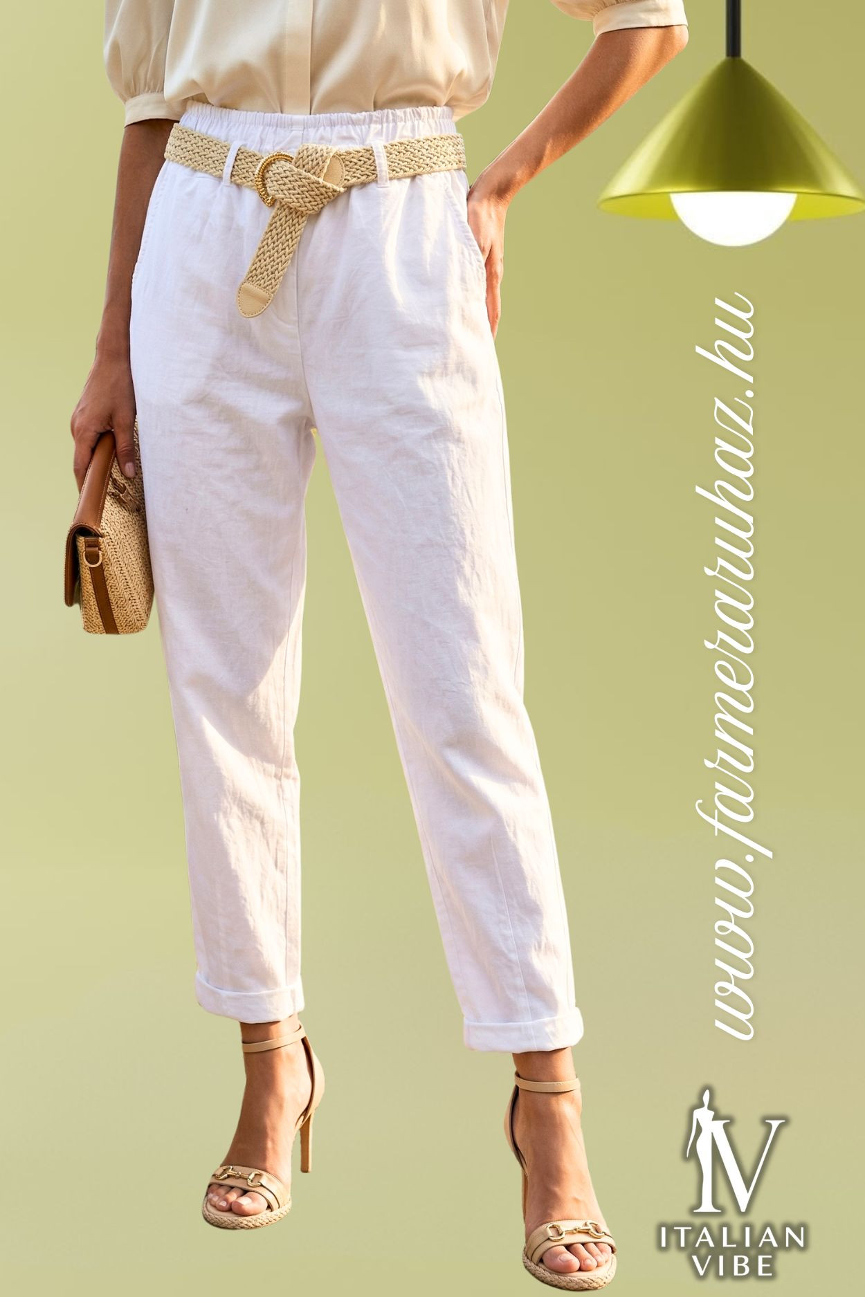 Italian Vibe - Tapered - fazonú női elasztikus vászon nadrág, fehér színben. Gumis dereka övbújtatós, hozzá tartozó fonott övvel, oldal és farzsebes.