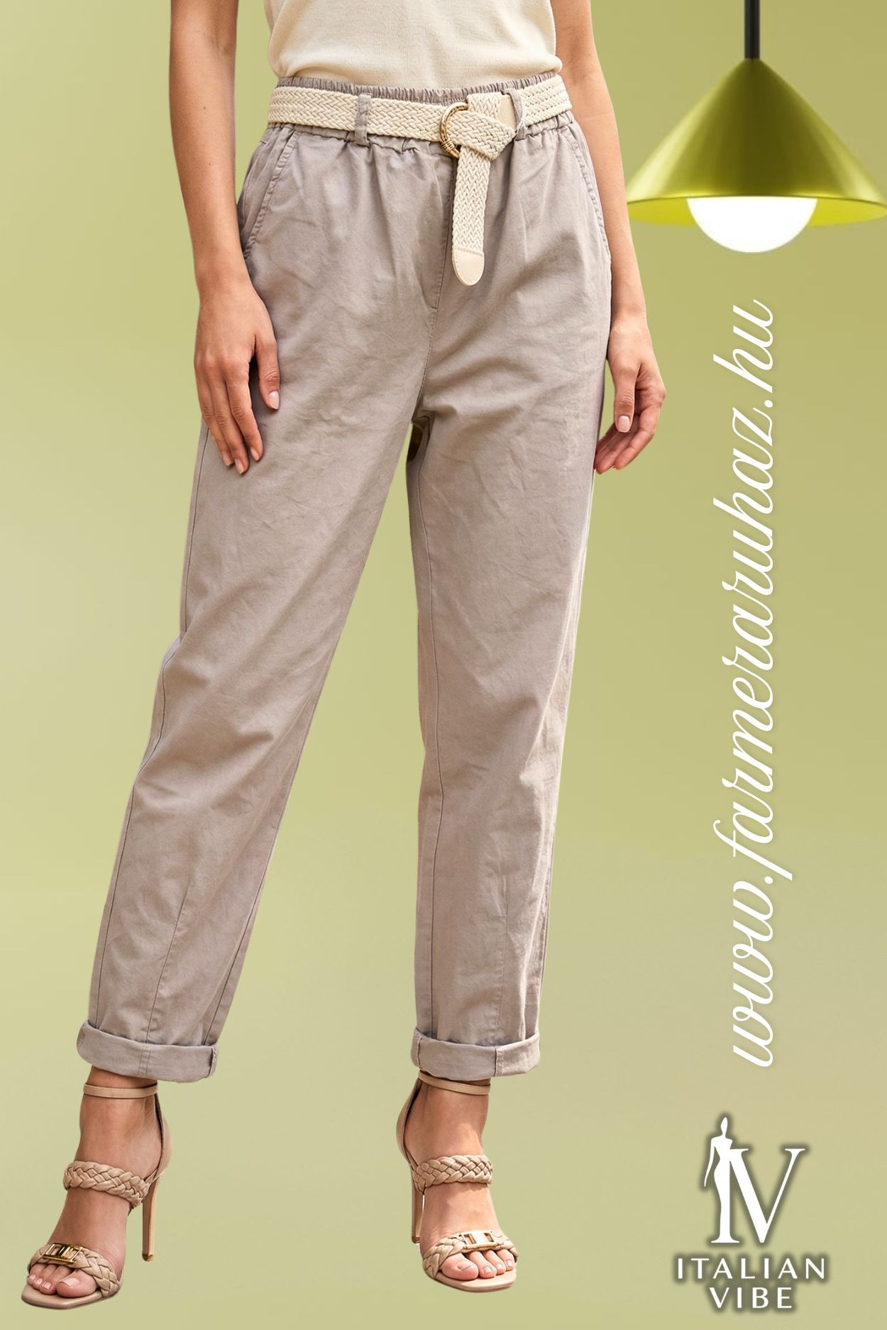 Italian Vibe - Tapered - fazonú női elasztikus vászon nadrág, fangó színben. Gumis dereka övbújtatós, hozzá tartozó fonott övvel, oldal és farzsebes.