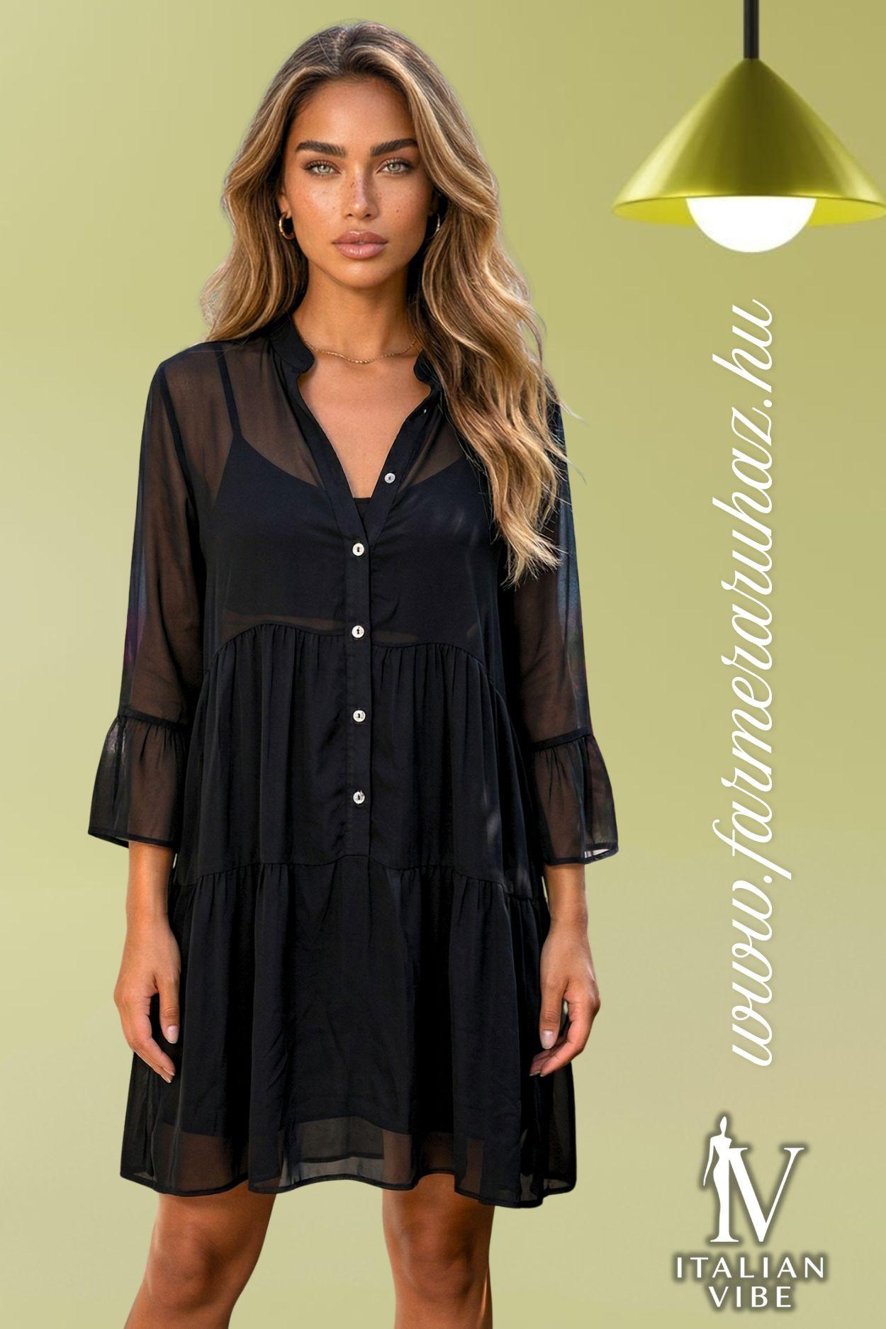 Italian Vibe dupla rétegű női ruha, fekete színben. Felső réteg muszlin hatású anyagból, lenge szabással, elején gombos. Alsó rétege egy spagetti pántos testhezálló ruha.