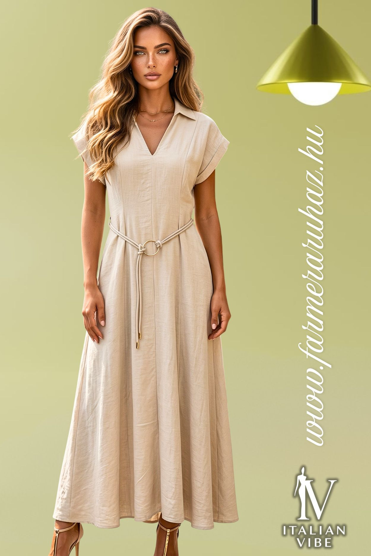 Italian Vibe női ruha, natúr bézs színben. Galléros, V kivágott, oldalzsebes, oldalában rejtett cipzárral, derekán övbújtatóval és hozzá tartozó vékony bőrhatású övvel.