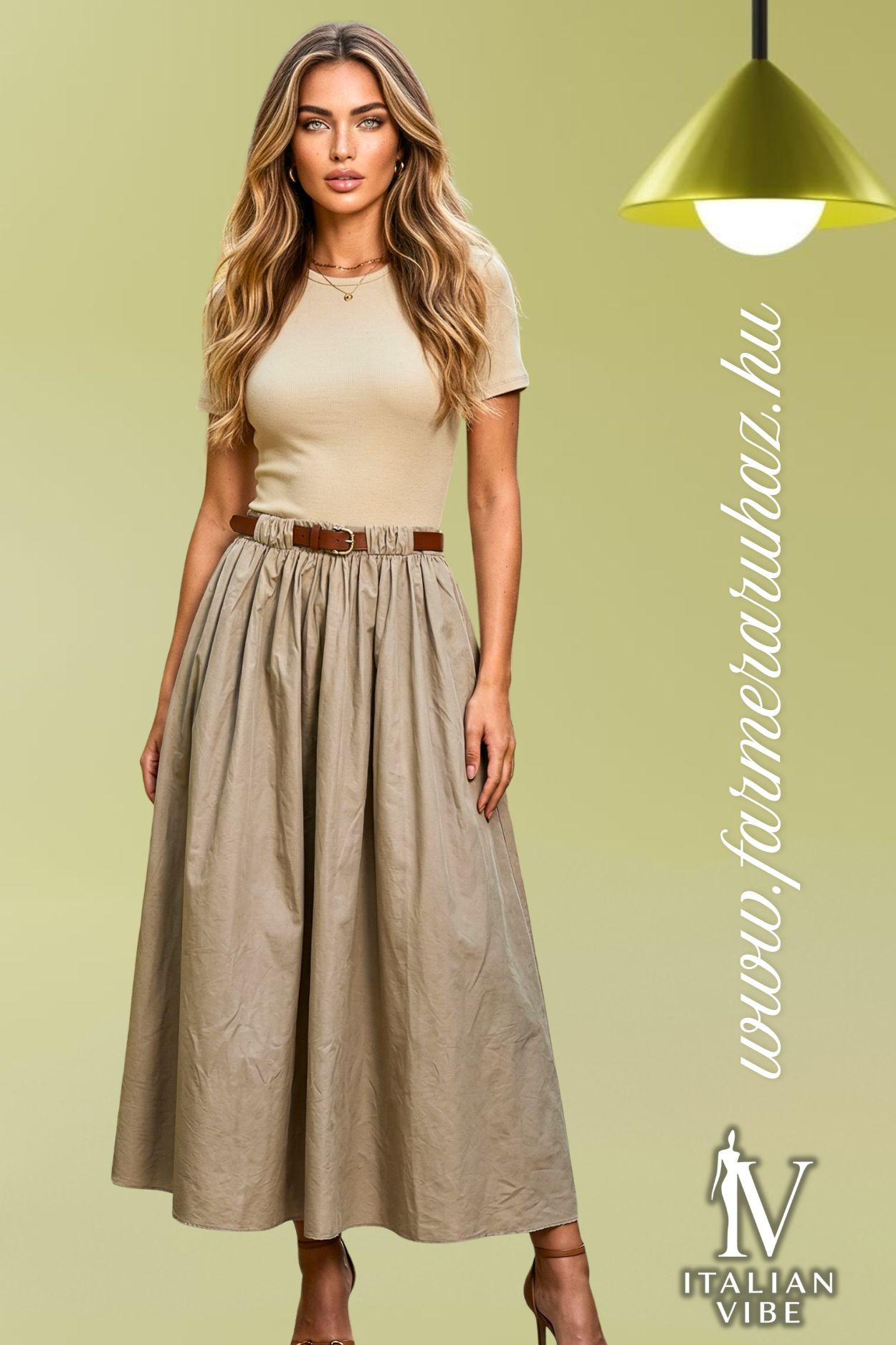 Italian Vibe női ruha, homok bézs színben. Póló fazonú felső résszel, hátulján rejtett cipzárral. Gumis derekán övbújtatóval, hozzá tartozó bőrhatású övvel. Szoknyája húzott és oldalzsebed.