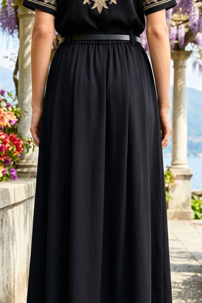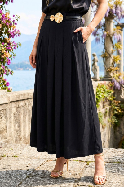 Italian Vibe női vászon szoknya, fekete színben. Dereka övbújtatós, hátul gumis, oldalában rejtett cipzárral. Elején dísz varrásokkal és hajtásokkal. Hozzá tartozó vékony bőrhatású övvel.