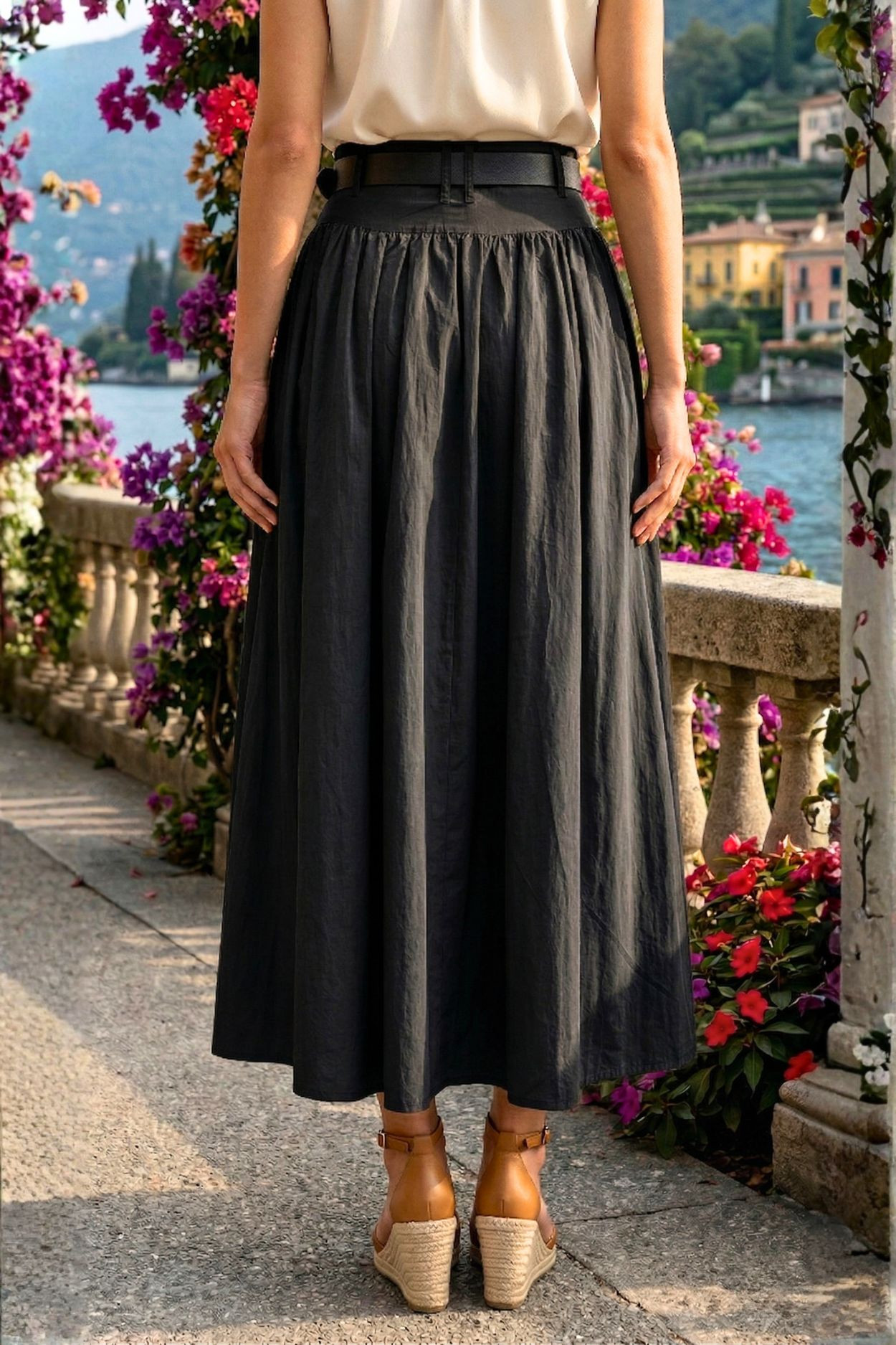 Italian Vibe vászon szoknya, fekete színben. Övbújtatós derékkal, oldalába rejtett cipzárral, hozzá tartozó bőrhatású övvel, térdig érő alsó réteggel.