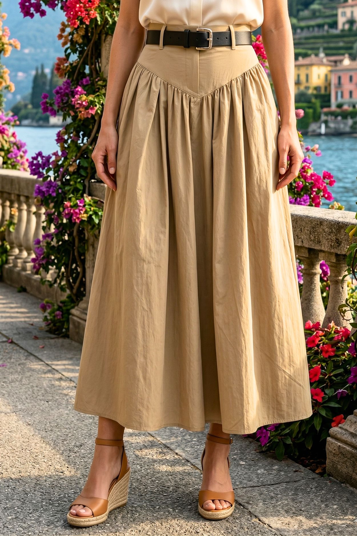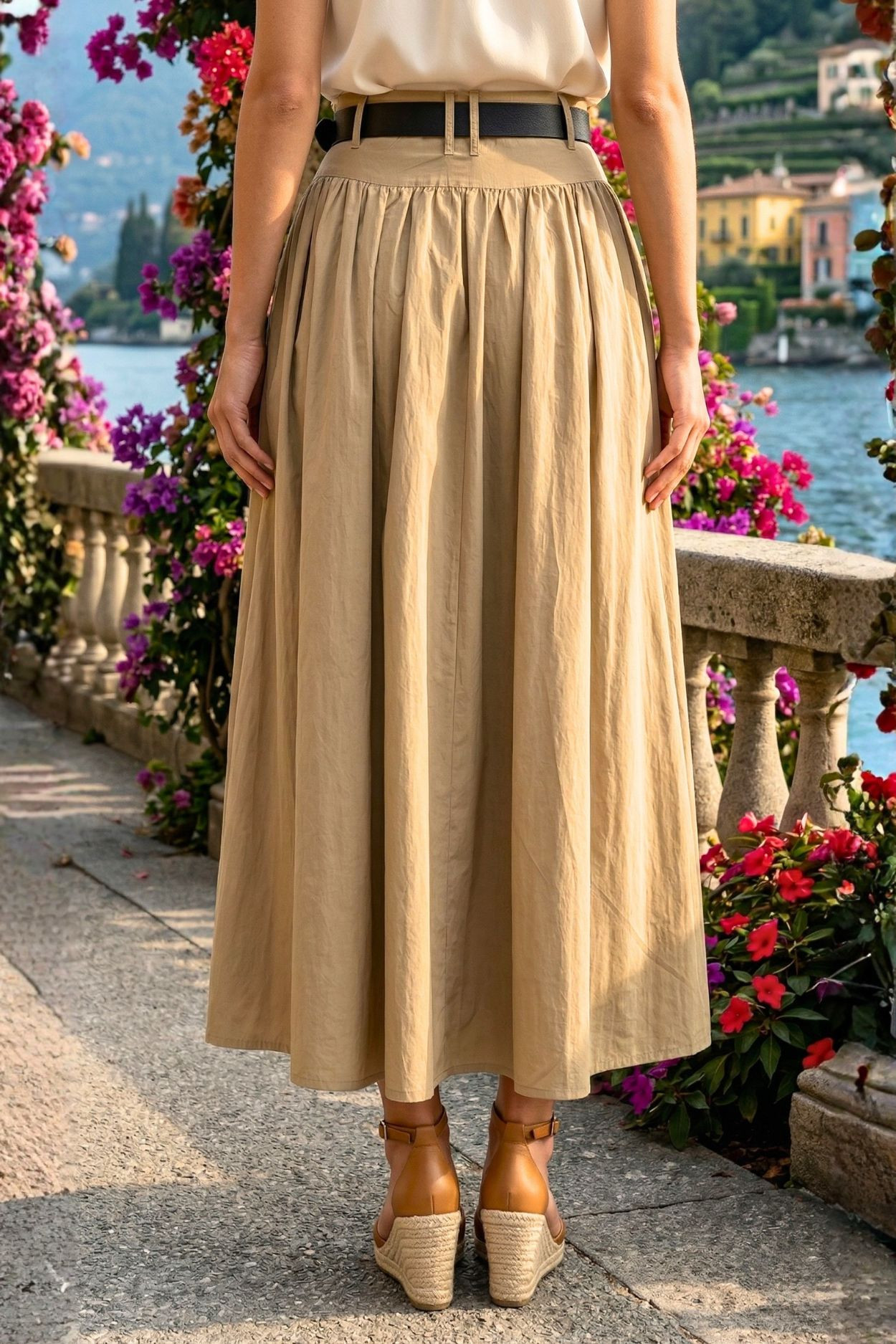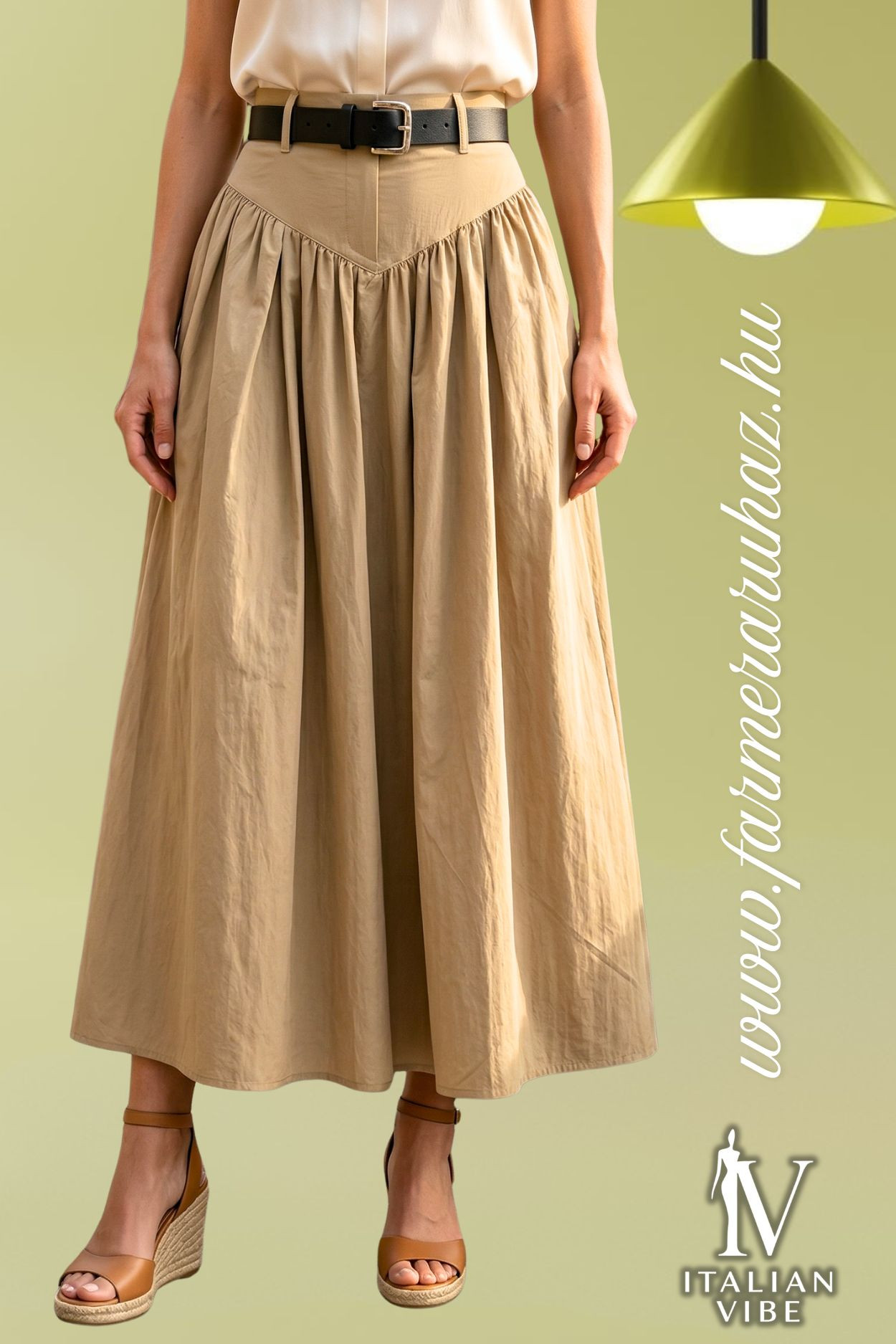 Italian Vibe vászon szoknya, bézs színben. Övbújtatós derékkal, oldalába rejtett cipzárral, hozzá tartozó bőrhatású övvel, térdig érő alsó réteggel.