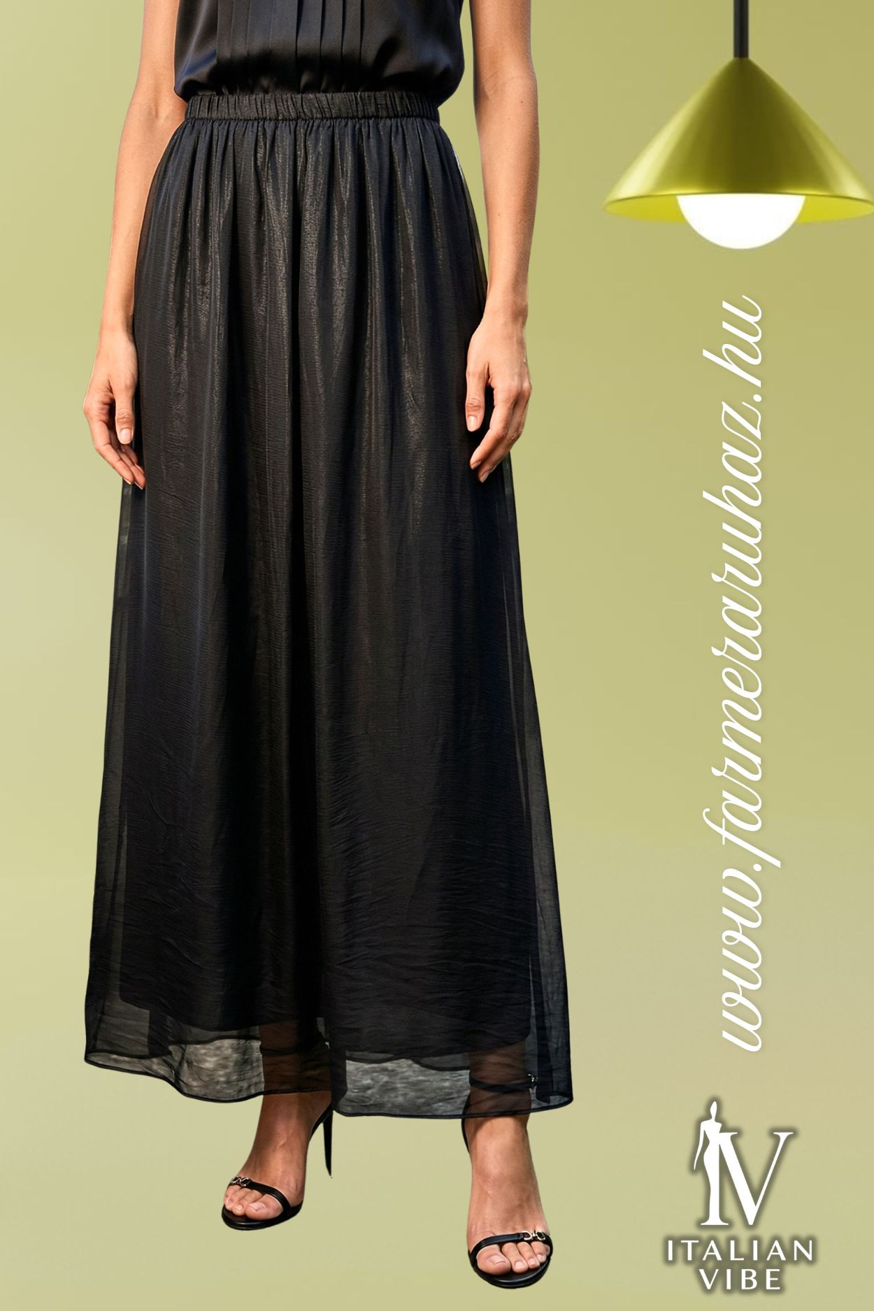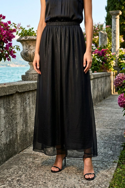Italian Vibe szoknya, fekete színben. Gumírozott derékkal, puha, lenge anyagból, dupla anyaggal.