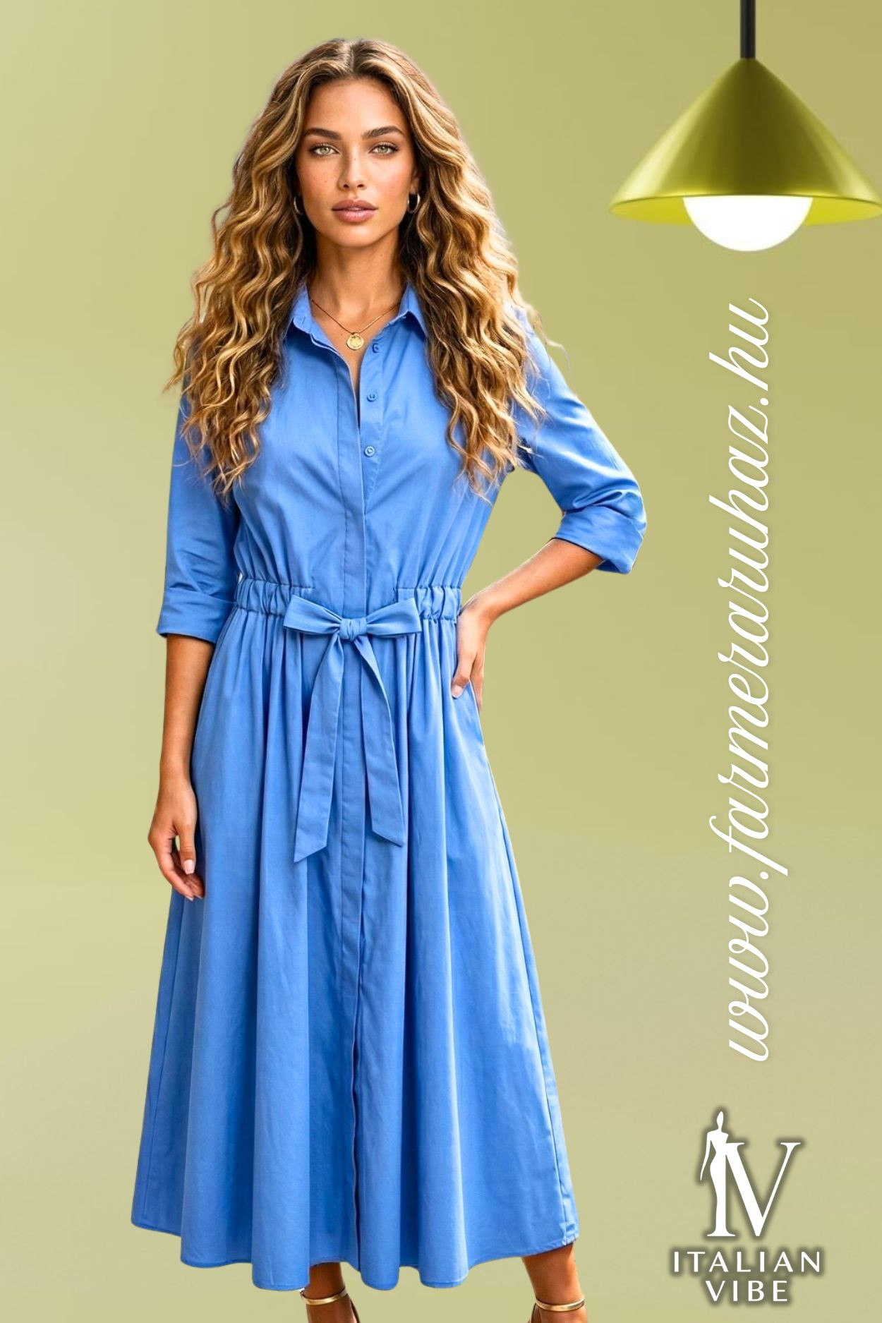 Italian Vibe prémium női ingruha, ég kék színben. Elején rejtett gombolással, húzott derekán megkötővel, oldalzsebekkel.