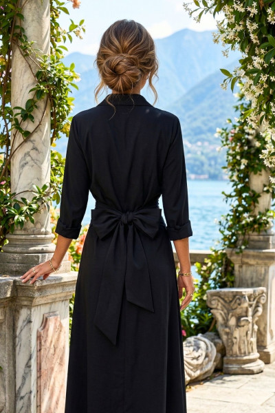Italian Vibe prémium női ingruha, fekete színben. Elején gombolással, derék részén átlapolt és megköthető , oldalzsebekkel.