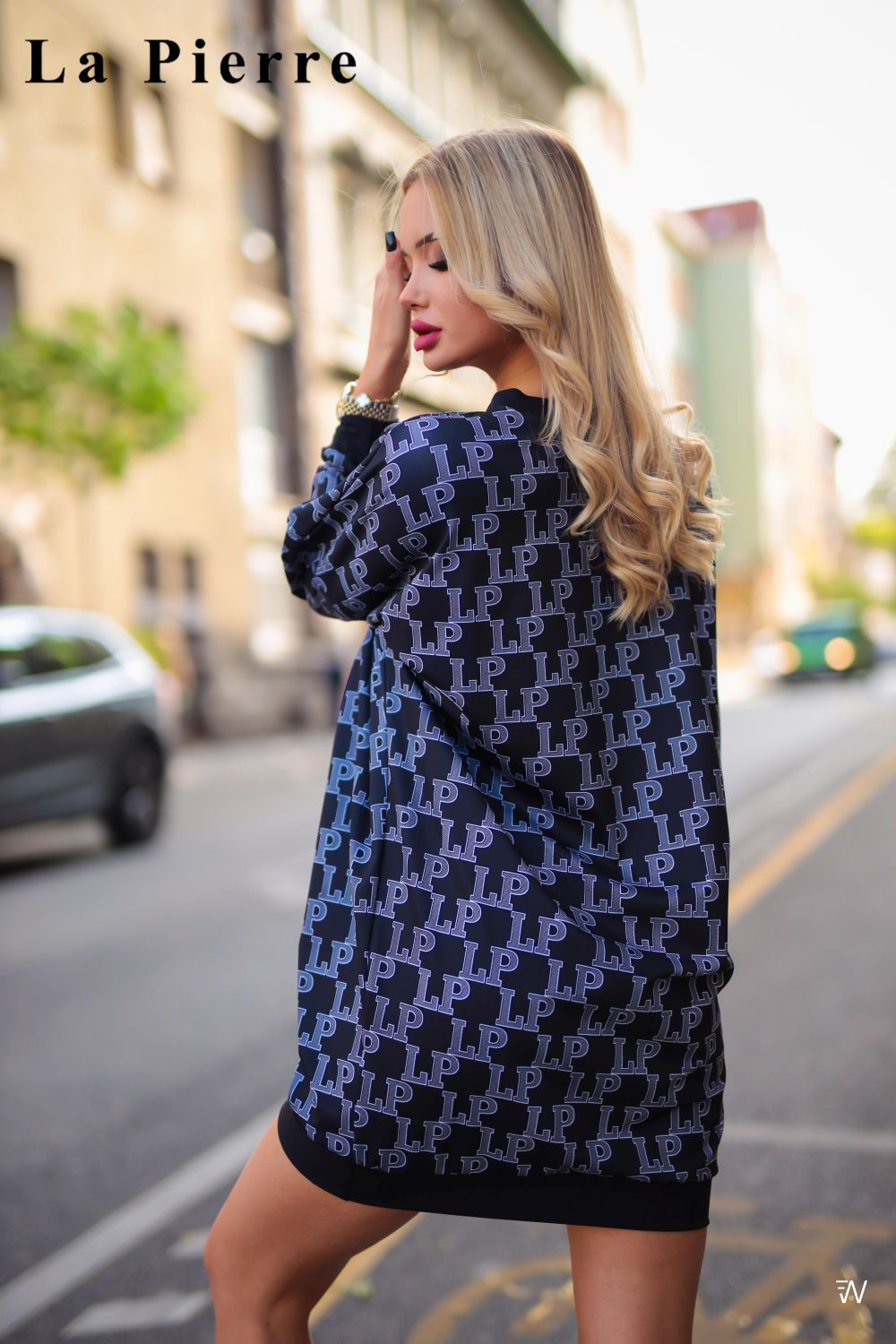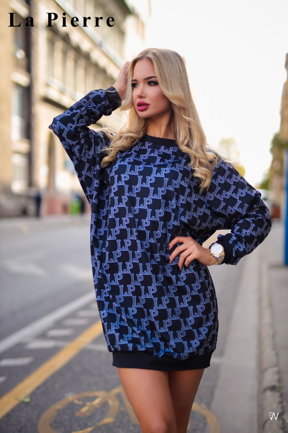 La Pierre női tunika fekete színben; oversize fazonban; kerek nyakkivágással; ejtett vállakkal; alján és kézelőjén passzéval; anyagában márkajelzéssel.