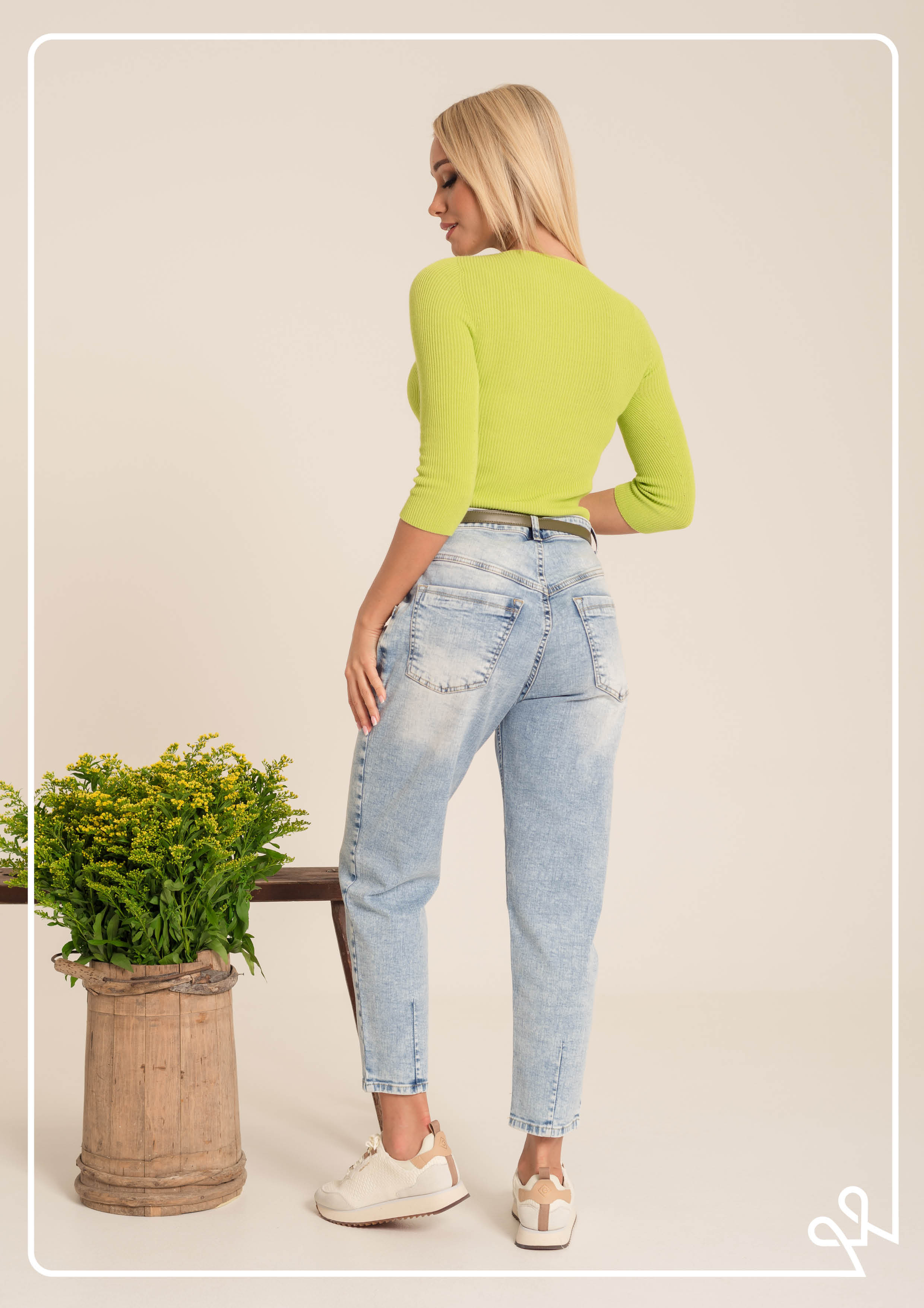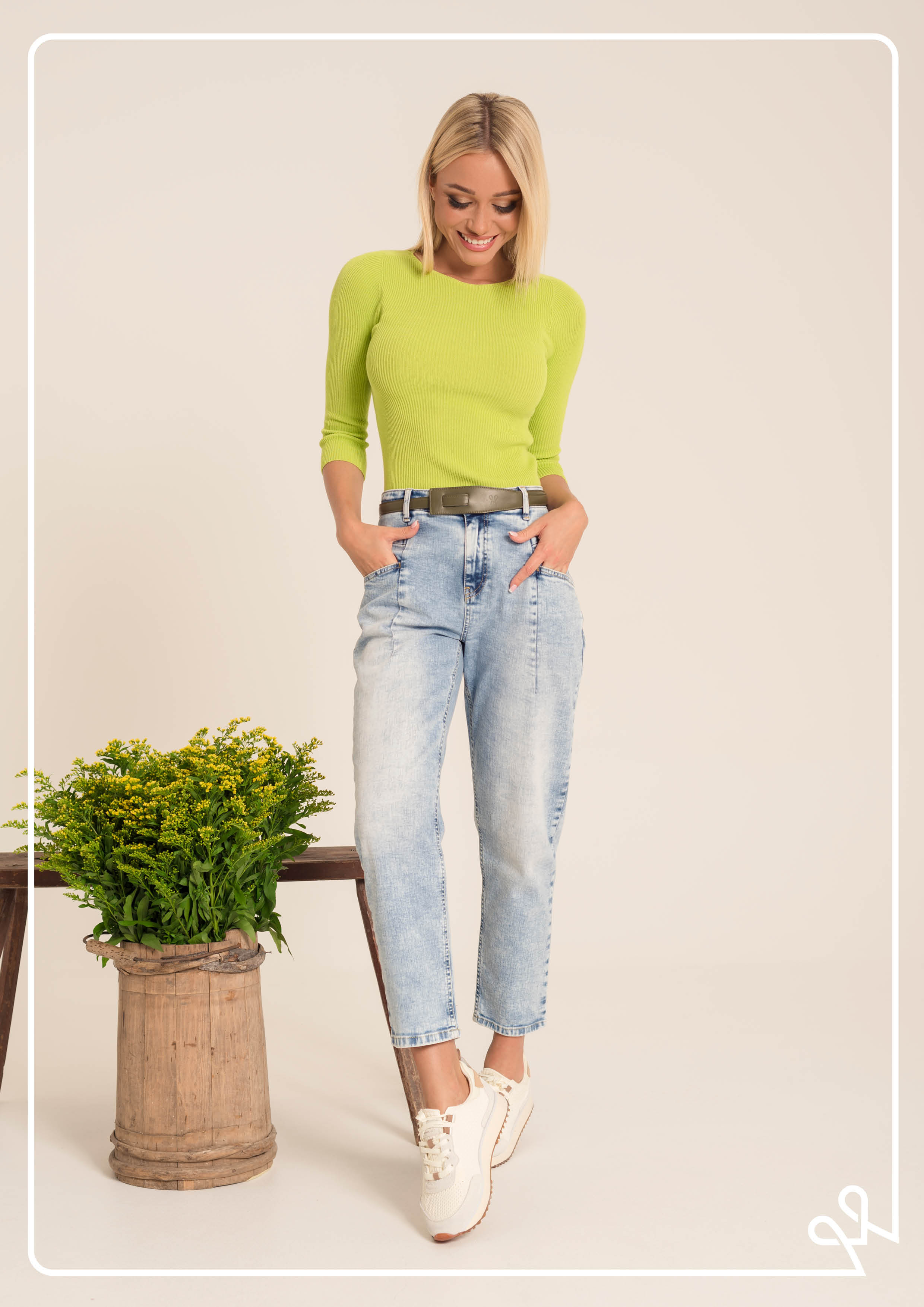 Magenta enyhén elasztikus farmernadrág, világoskék színben, laza fazonú, koptatott, bokáig érő hosszal, elején és hátán elnagyolt zsebekkel, cipzáras és gombos záródással, övbújtatós derékrésszel, derekán- és elején rávarrt textil márkajelzéssel.