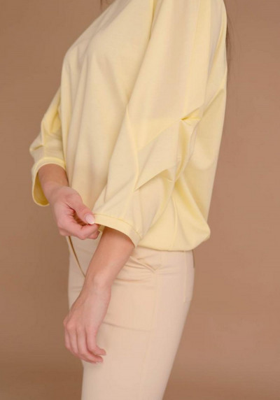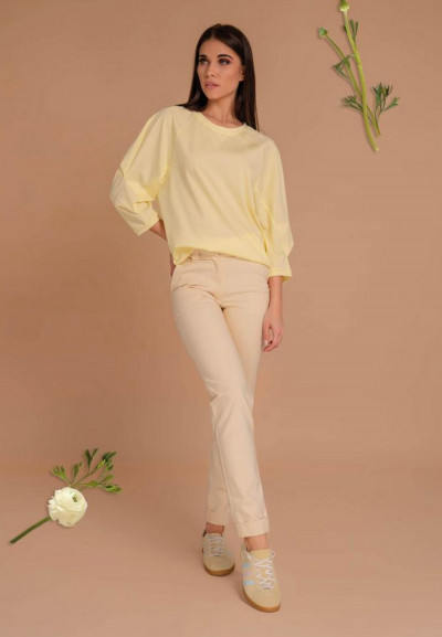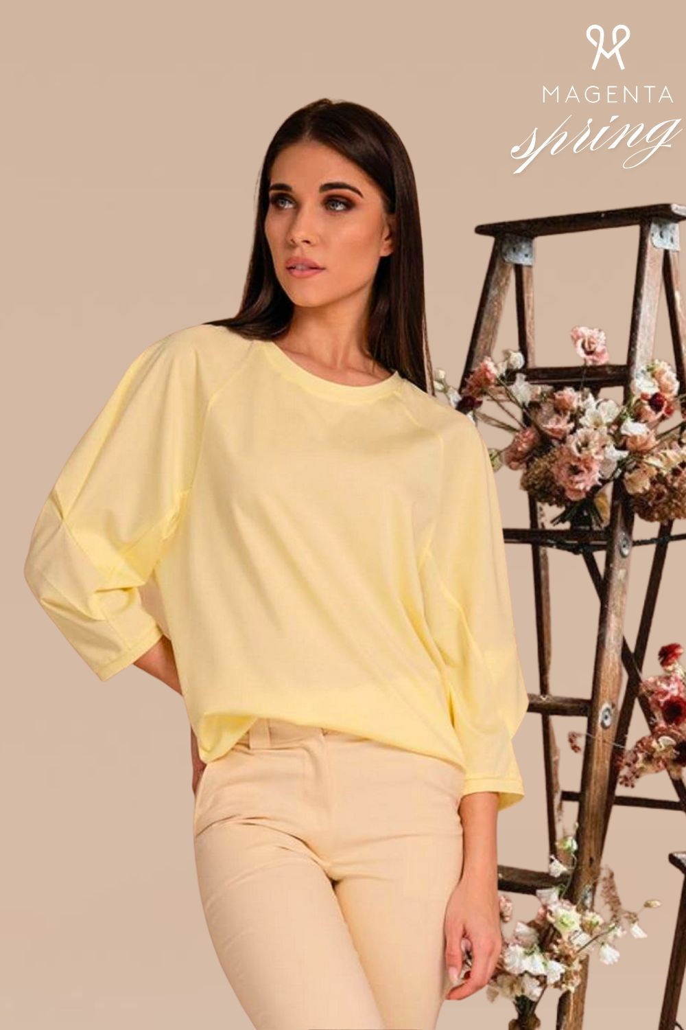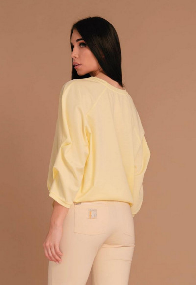 Magenta kevert szálas felső, bő fazonú, sárga színben, ujján hajtásokkal díszített, kerek nyakkivágással. Hátul filmnyomott márkajelzéssel.