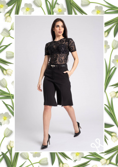 Magenta flitteres-tüll felső, fekete színben. Szűk fazonú, kerek nyakkivágással, rövid ujjal. Oldalán rávarrt márkajelzéssel.