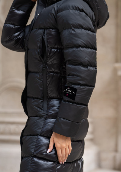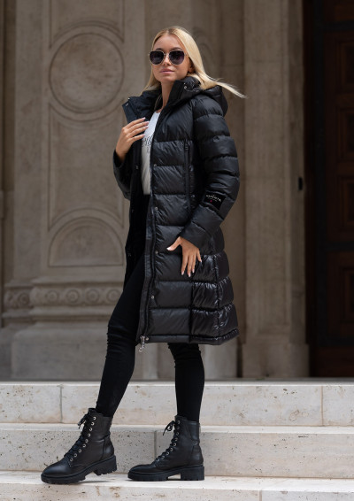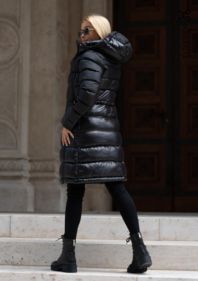 Magenta steppelt hosszú téli kabát fekete színben; matt és selyemfényű anyagok kombinációjából; karcsúsított fazonban; lezipzárolható kapucnival; elejében patentos és zipzáras záródással; zipzáras dupla zsebekkel; egy kisméretű, zipzáras belső zsebbel; ujján rávarrt textil márkajelzéssel az őszi/téli Magenta kollekcióból.