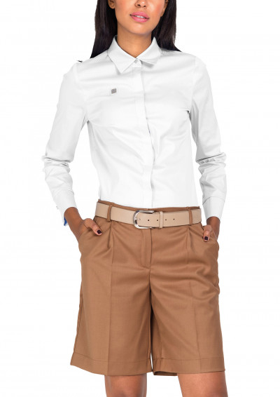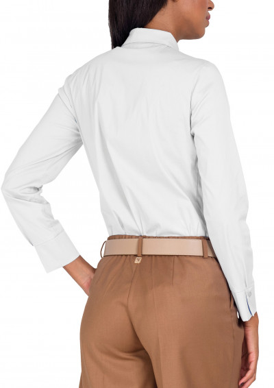 Magenta (45%) pamut, (50%) poliészter és (5%) elasztán összetételű; enyhén elasztikus vászonból készült ing; fehér színben; karcsúsított fazonban; elején rejtett gombos záródással; hasítékos kézelővel; elején kisméretű fém márkajelzéssel az őszi Magenta kollekcióból.