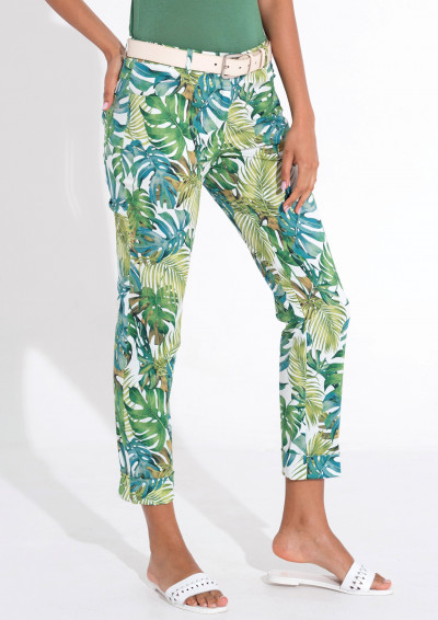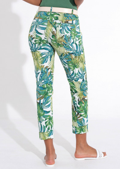 Magenta pamut (95%) és (5%) elasztán összetételű fehér alapon zöld levél mintás, elasztikus pamut-vászon nadrág, övbújtatós derékrésszel, dupla gombos és cipzáras záródással, zsebén rávarrt textil márkajelzéssel a tavaszi Magenta kollekcióból.