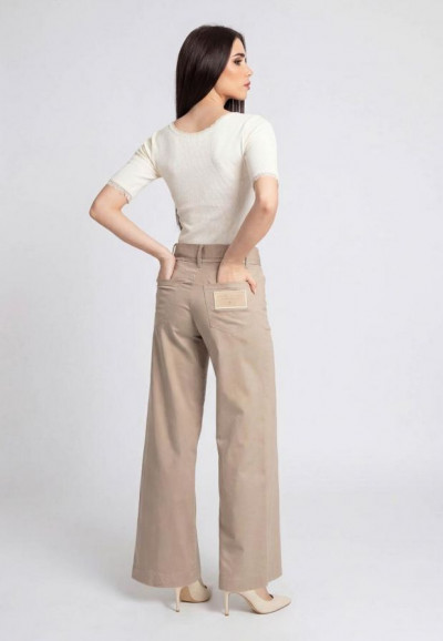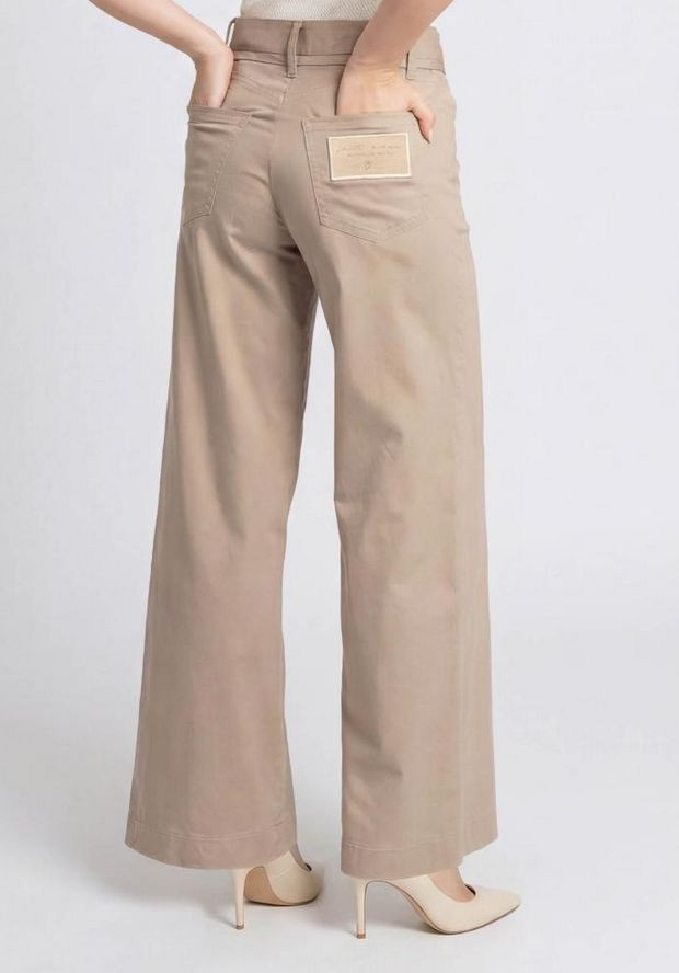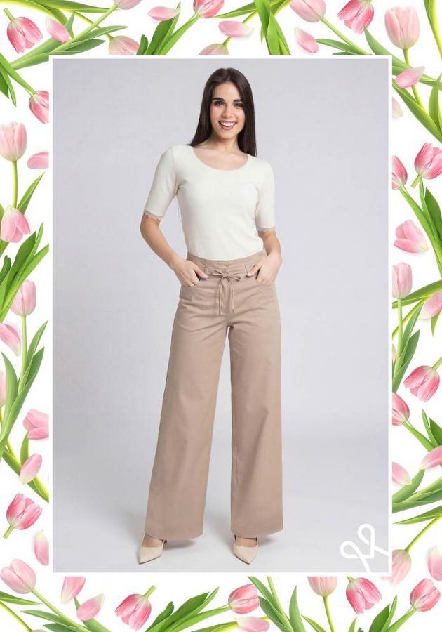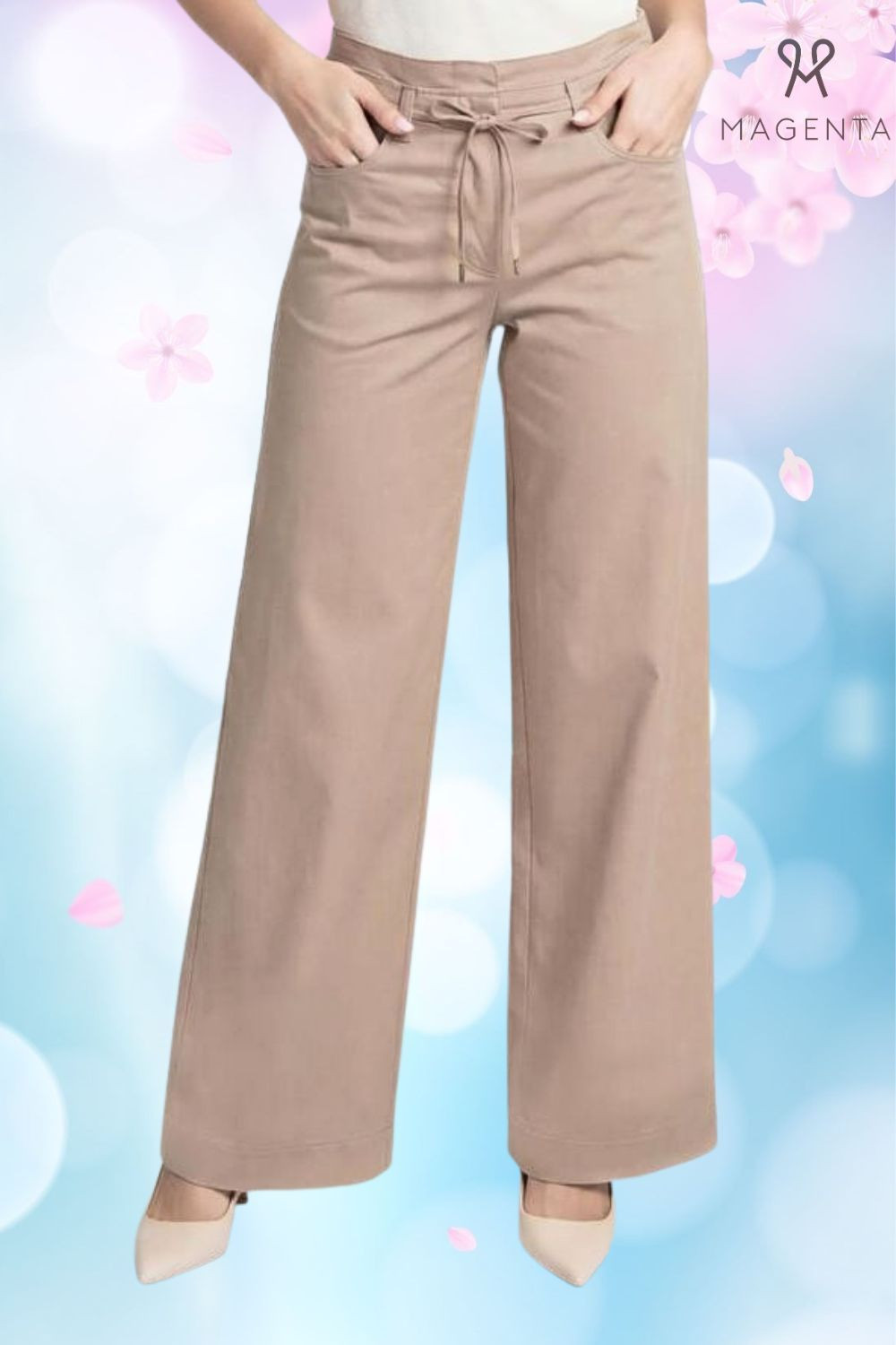Magenta vászon nadrág, bézs színben. Bővebb szárú, elején gombos és pattentos záródással, derékrészen megkötővel, zsebekkel. Hátul rávarrt márkajelzéssel.