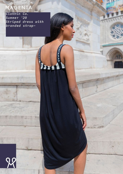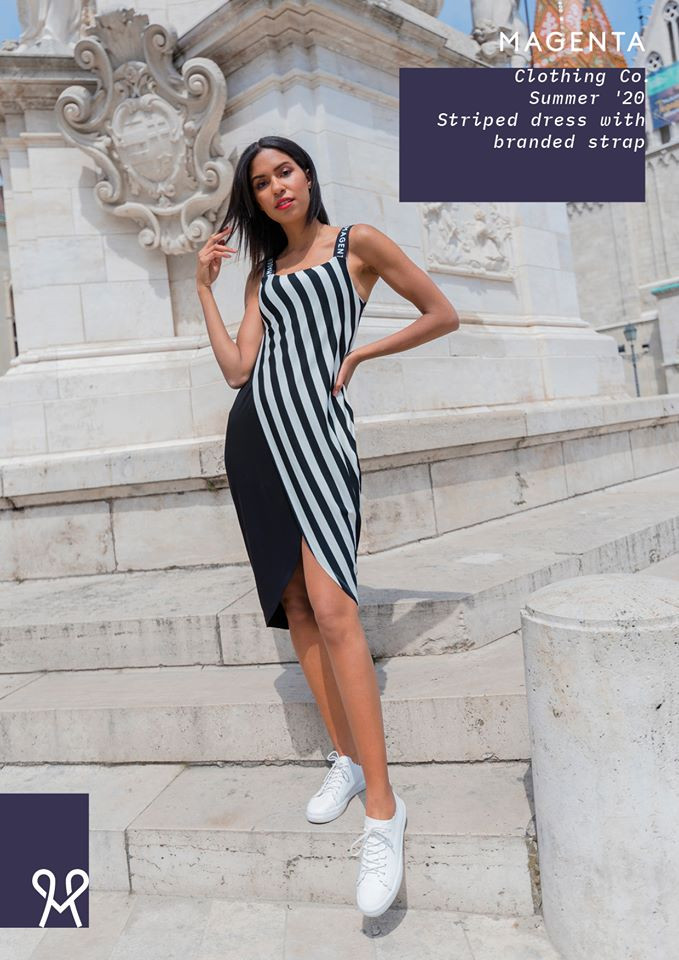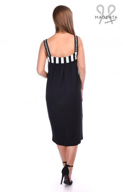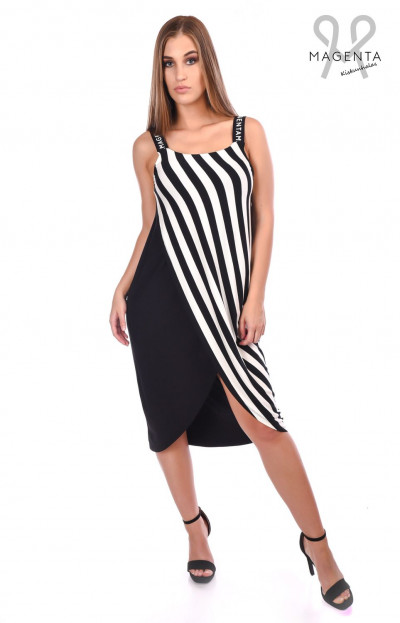 Magenta viszkóz (93%) és elasztán (5%) összetételű ruha, fekete színben, fehér csíkos mintával, alja felslicelt, elején átlapolt dupla anyagú, márkajelzett gumírozott pántokkal a nyári Magenta kollekcióból.