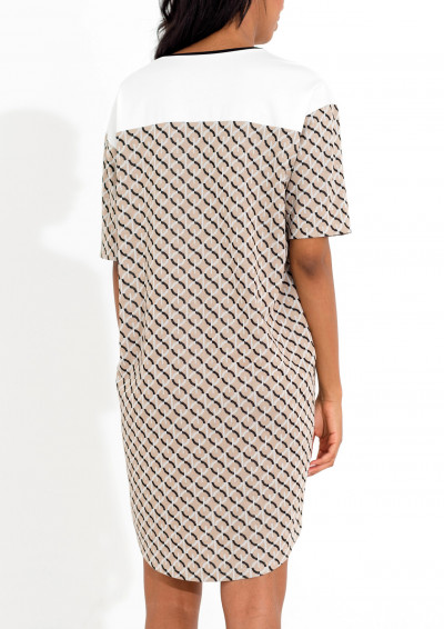 Magenta viszkóz (50%), poliészter (45%), és elasztán (5%) összetételű fangó-krém és fekete színű mintás, bő fazonú, puntó tunika oldalzsebekkel, fekete nyaki szegővel, hátulja enyhén hosszabb. Elején és az alján filmnyomott márkajelzéssel a tavaszi Magenta kollekcióból.