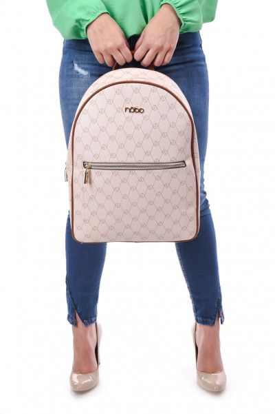 Nobo hátizsák krém színű bőrhatású anyagból; zipzáros záródással; állítható vállpánttal; egyterű belsőrésszel; belsejében egy kisméretű rekesszel; elején cipzáras rekesszel és fém márkajelzéssel a Nobo kollekcióból.