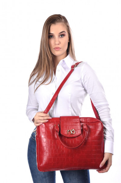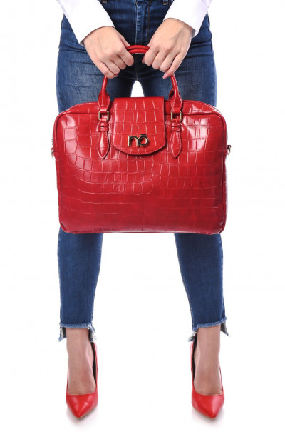 NOBO nagyméretű kézi- és válltáska krokodil mintás, piros színű bőrhatású anyagból; cipzáros és forgózáras záródással; egyterű belsőrésszel; belsejében két kisméretű rekesszel és egy cipzáros zsebbel; egy laptoptartó rekesszel; elején fém márkajelzéssel a NOBO kollekcióból.