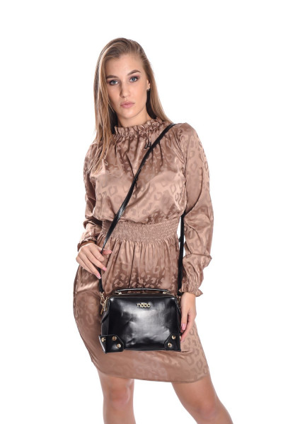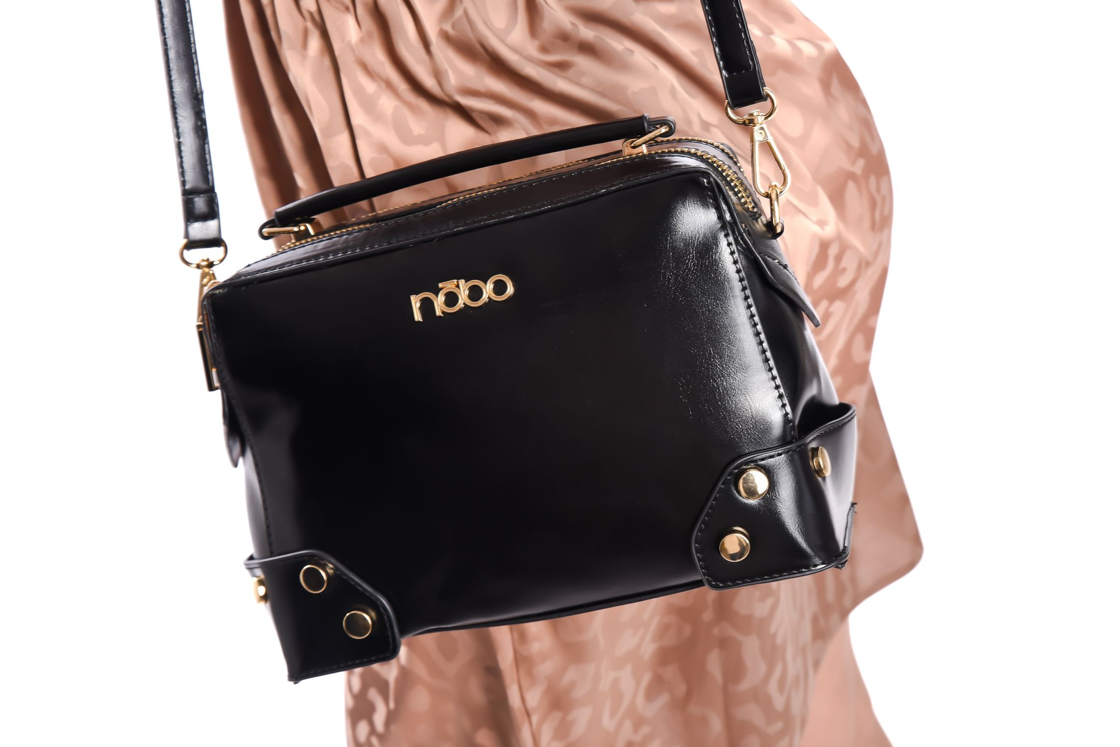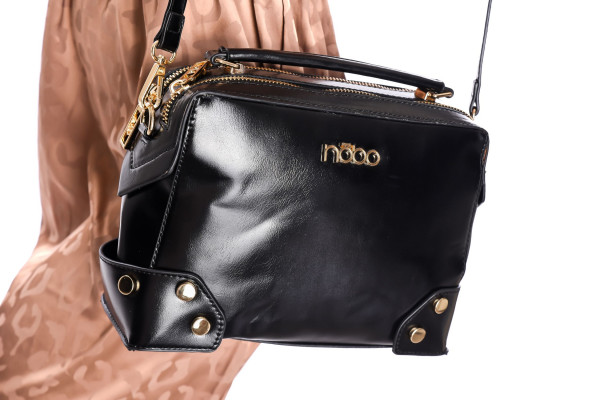 Nobo női kézi- és oldaltáska fekete színben; arany színű kiegészítőkkel; szegecses díszítéssel; levehető és állítható pánttal; cipzáras záródással; belseje kétterű; benne egy cipzáras zsebbel és két rekesszel; elején fém márkajelzéssel.