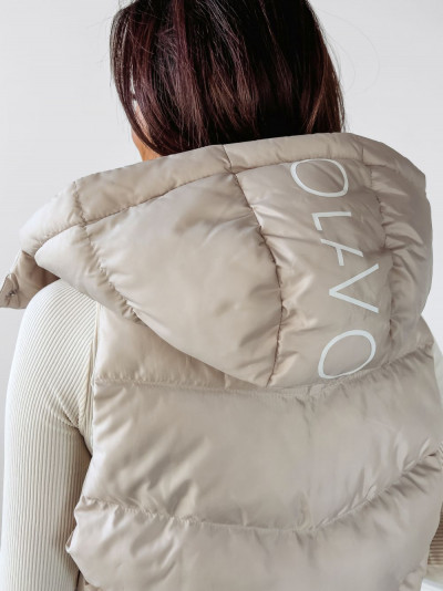 O La Voga női steppelt mellény, pezsgőhab színben, magasított nyakrésszel, lecipzározható kapucnival, oldalzsebekkel, cipzáras és patentos záródással, mellrészén és kapucniján filmnyomott márkajelzéssel.