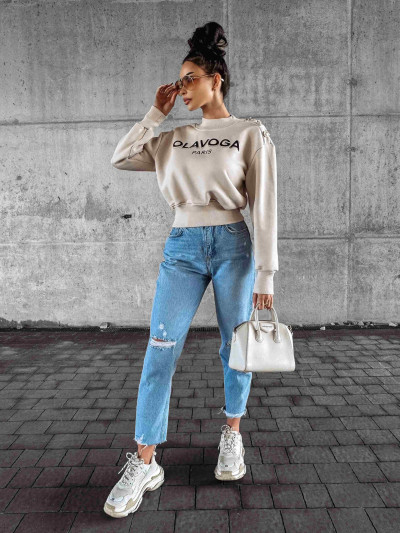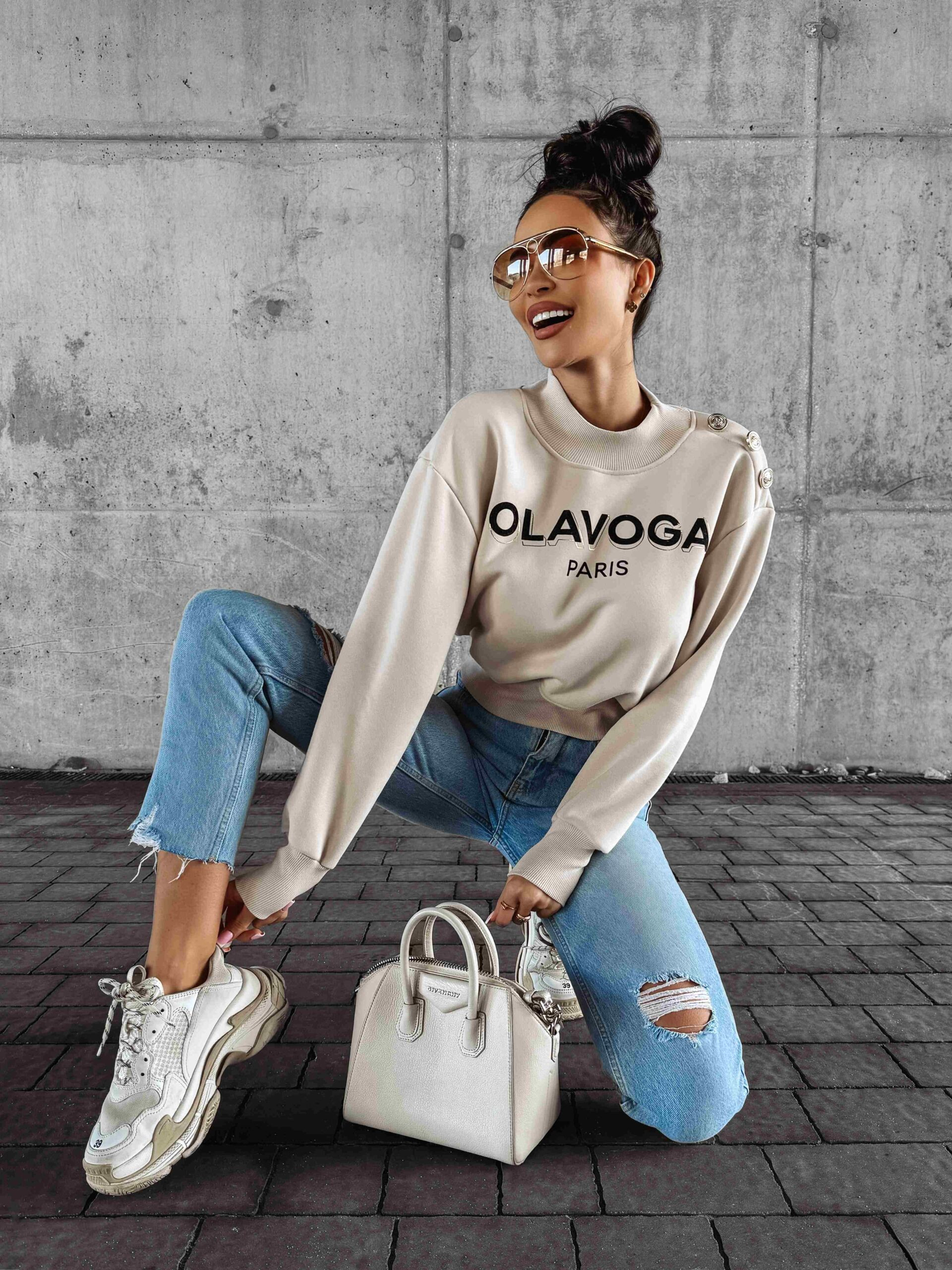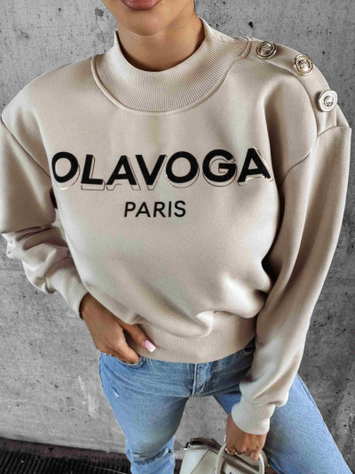 O La Voga női pulóver, bézs színben, bővebb fazonban, alján és ujján passzéval, vállán díszgombokkal, mell részén flokkolt és filmnyomott márkajelzéssel.