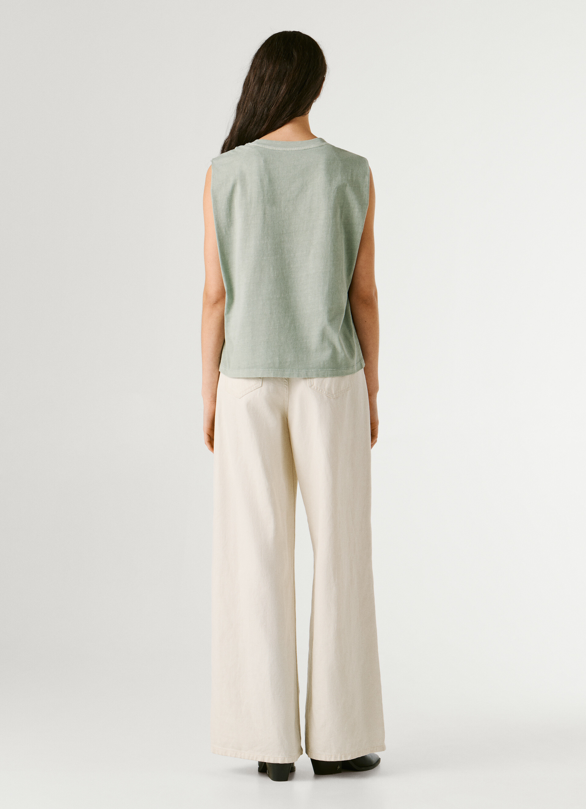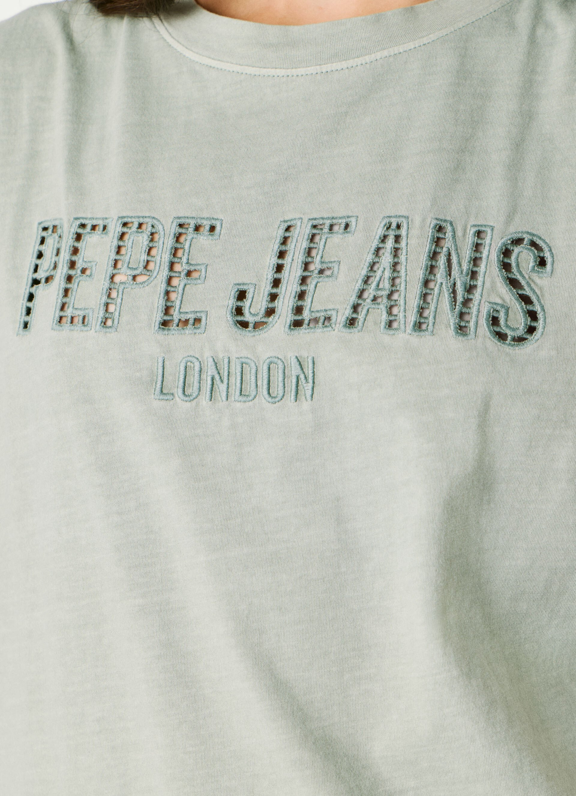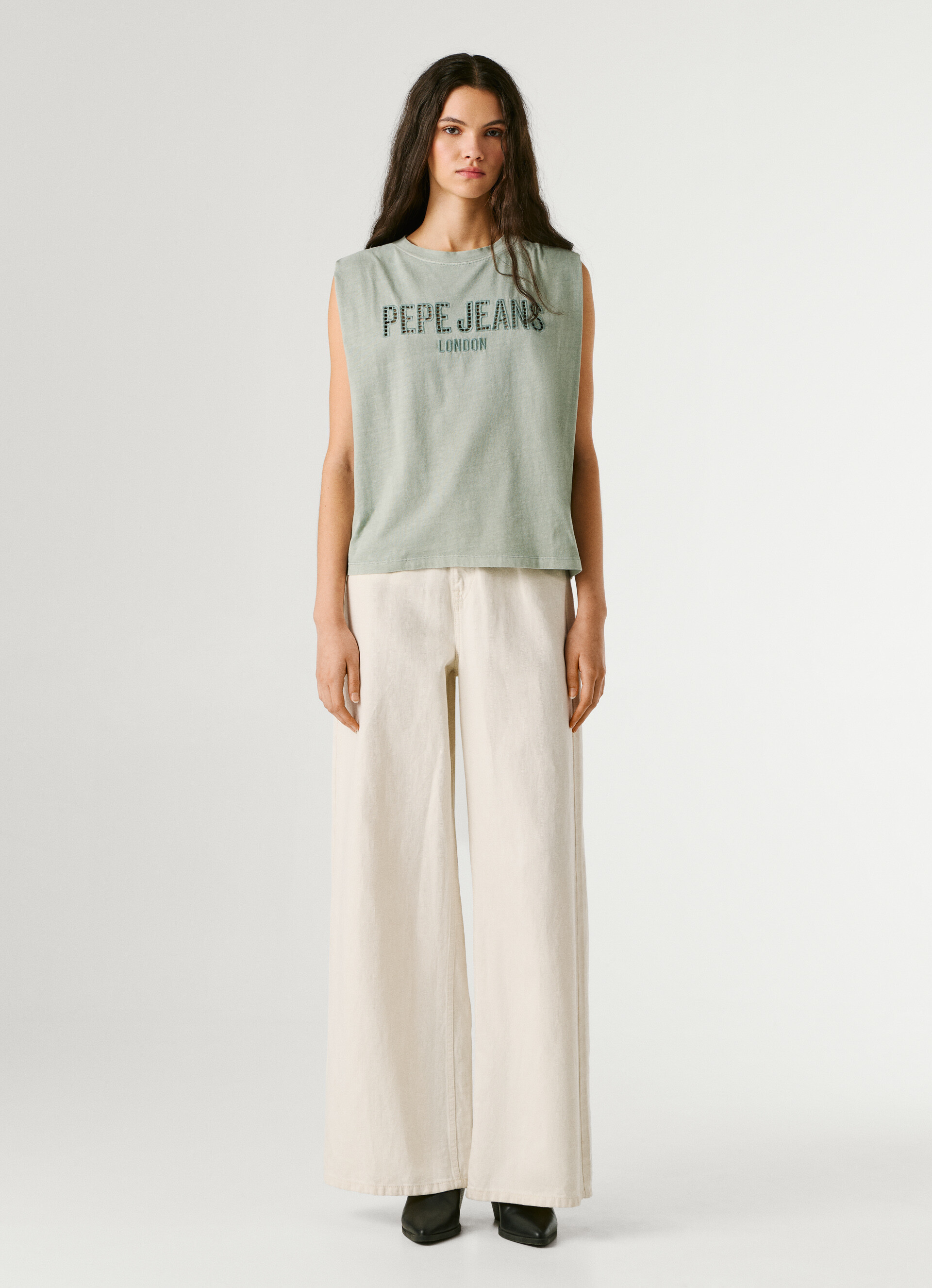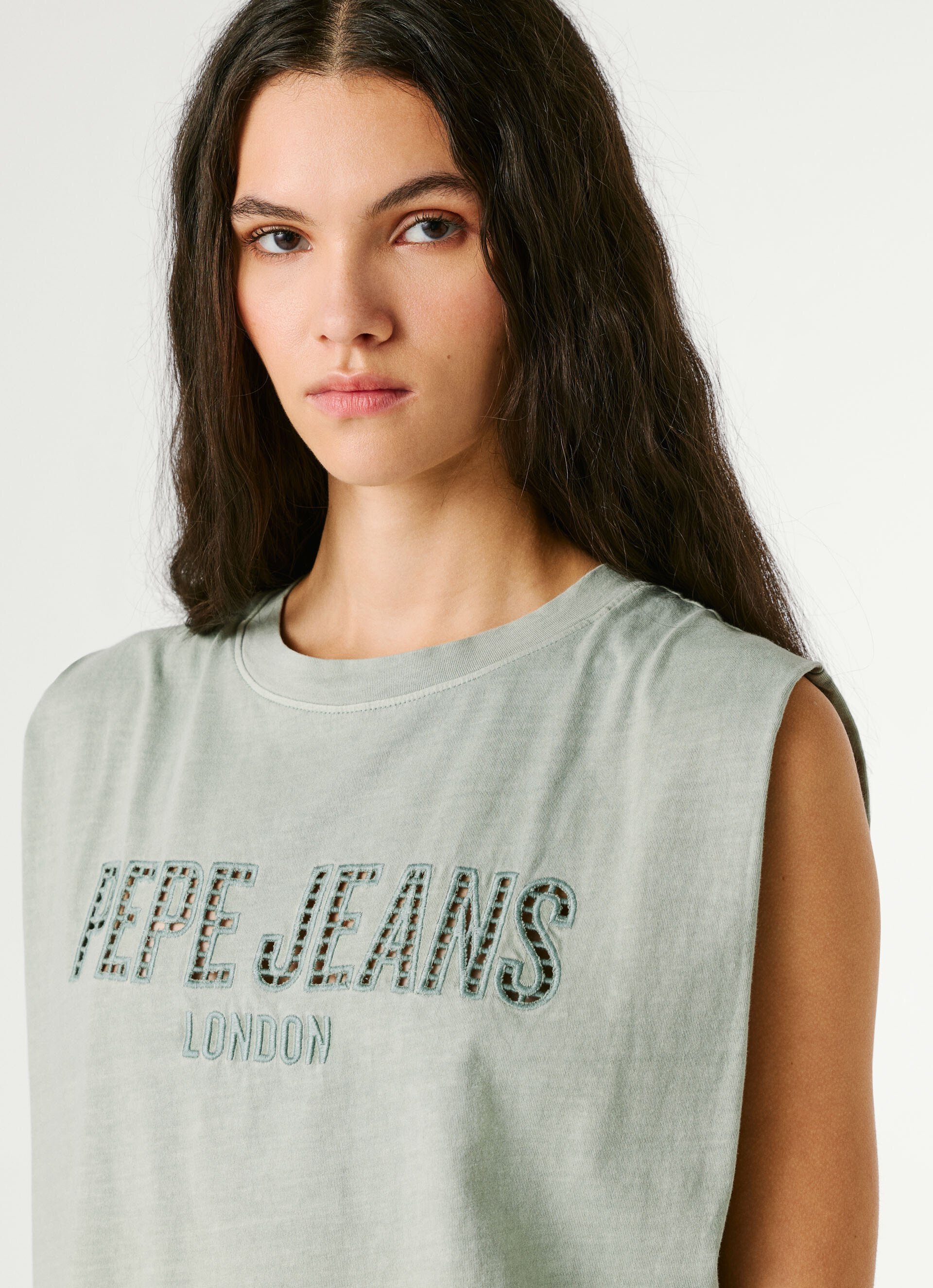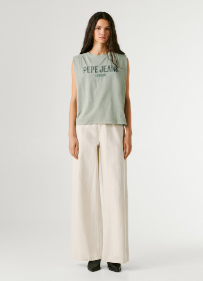Pepe Jeans bővebb fazonú ujjatlan felső fáradt zöld színben; egyenes szabással; kerek nyakkivágással; mell részén nagyméretű, horgolt hatású (nyitott) és hímzett márkajelzéssel.