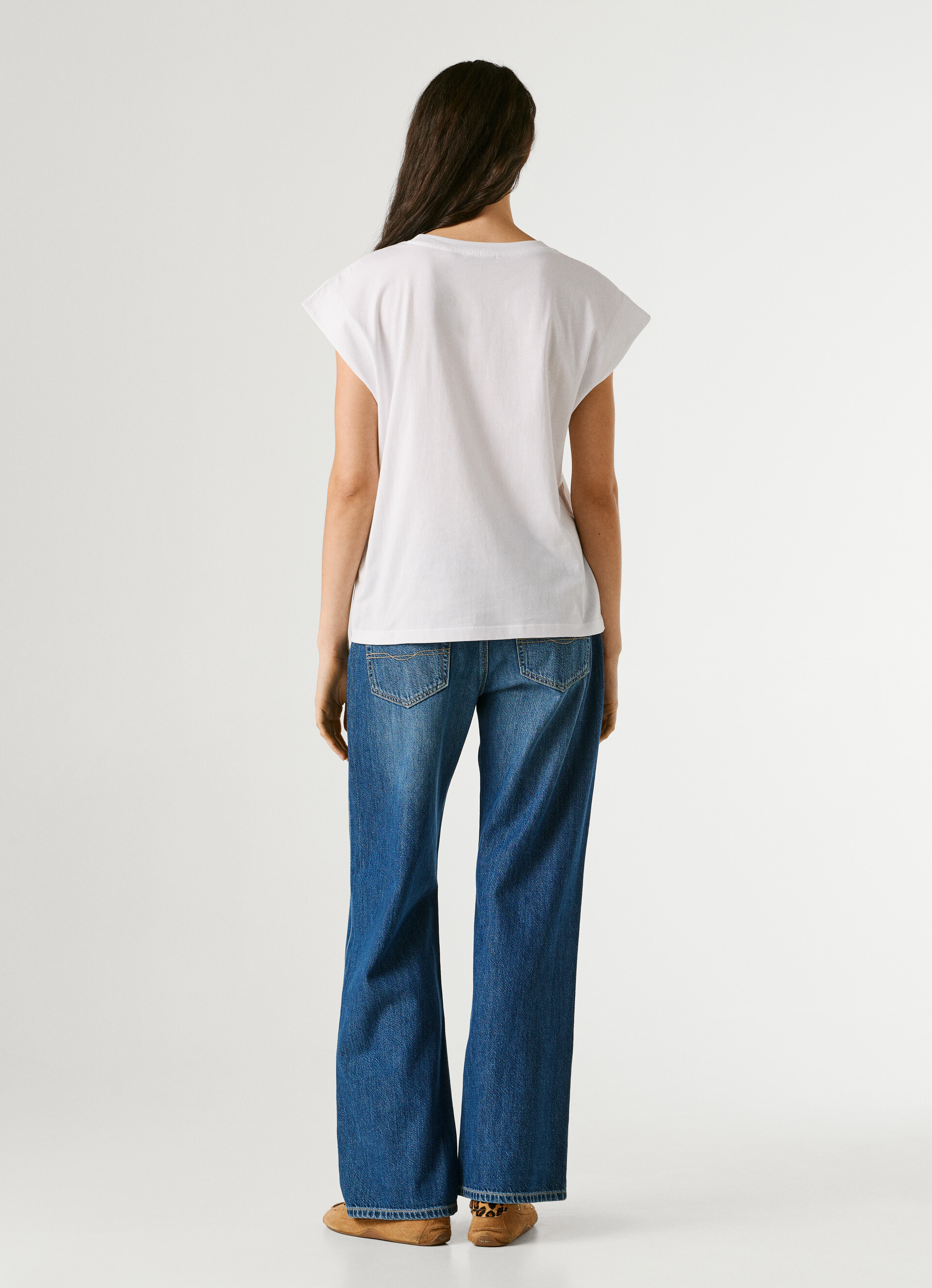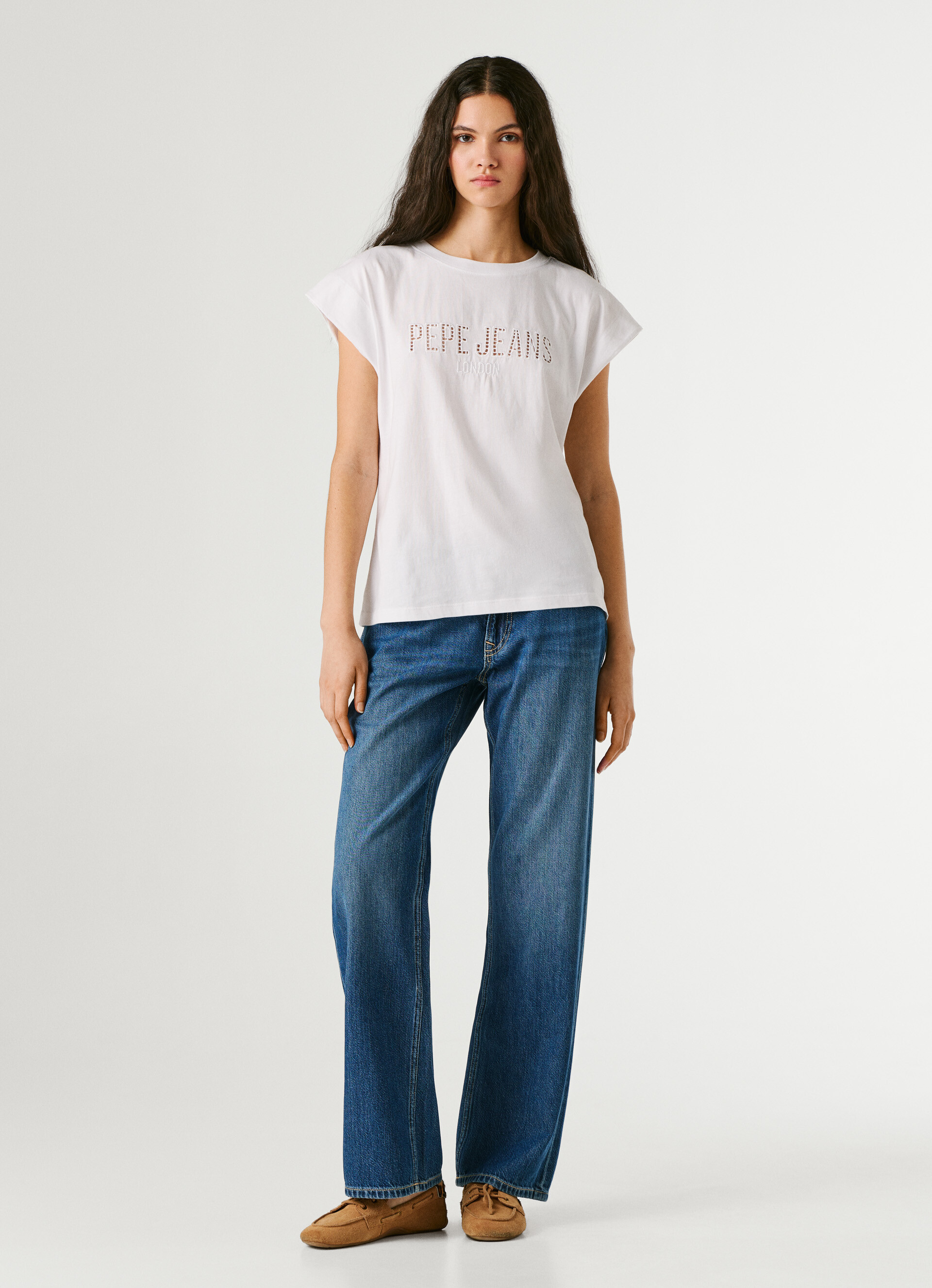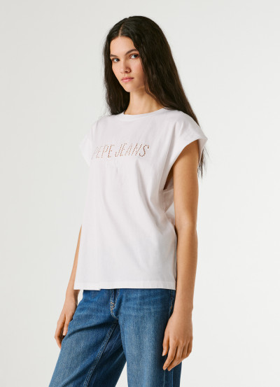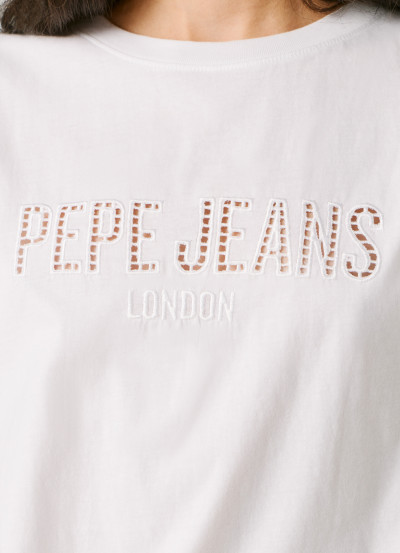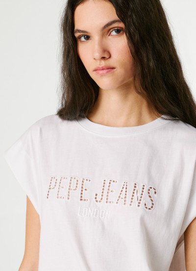 Pepe Jeans bővebb fazonú ujjatlan felső fehér színben; egyenes szabással; kerek nyakkivágással; mell részén nagyméretű, horgolt hatású (nyitott) és hímzett márkajelzéssel.