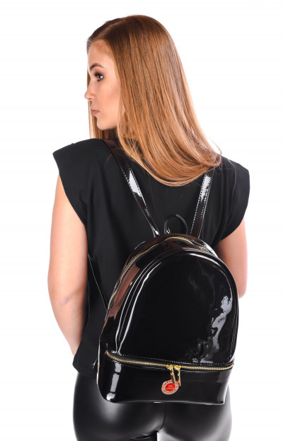 Prestige fekete színű gyöngyház hatású lakkozott rostbőr hátizsák; cipzáros záródással; egyterű belsőrésszel; belsejében egy rekesszel és egy cipzáros zsebbel; elején cipzáras zsebbel; arany színű fémkellékekkel; elején fém márkajelzéssel a Prestige kollekcióból.