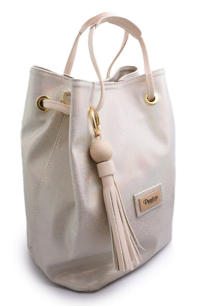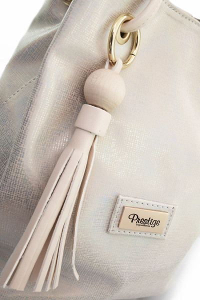 Prestige kézi és oldaltáska gyöngyház színű szövet mintás- és bézs színű műbőr anyagból, fülén rojtos díszítéssel; mágneses záródással; lecsatolható állítható pánttal, mellyel oldaltáskává alakítható; egyterű belsőrésszel; belsejében egy rekesszel és egy cipzáros zsebbel; elején fém márkajelzéssel a Prestige kollekcióból.