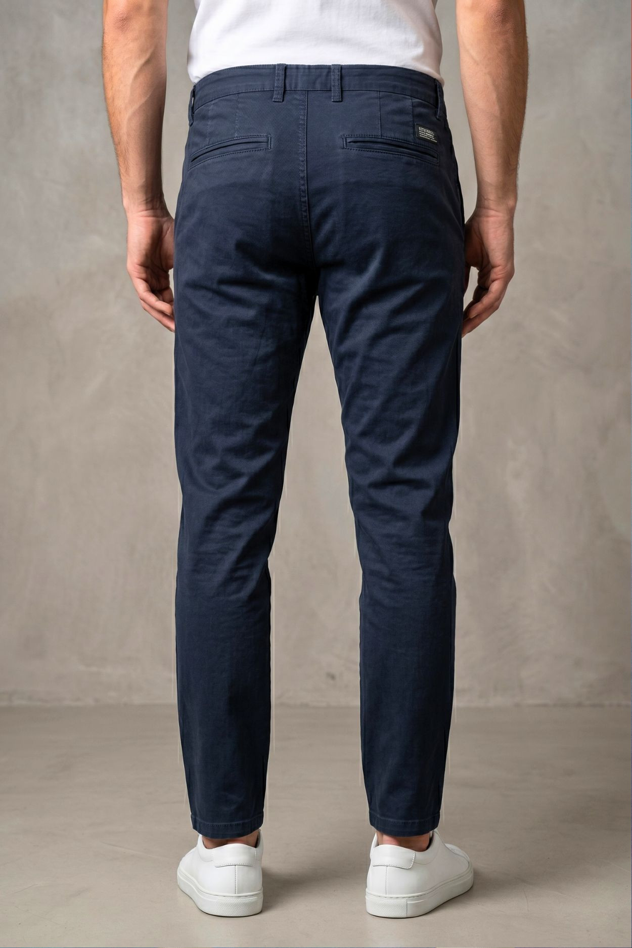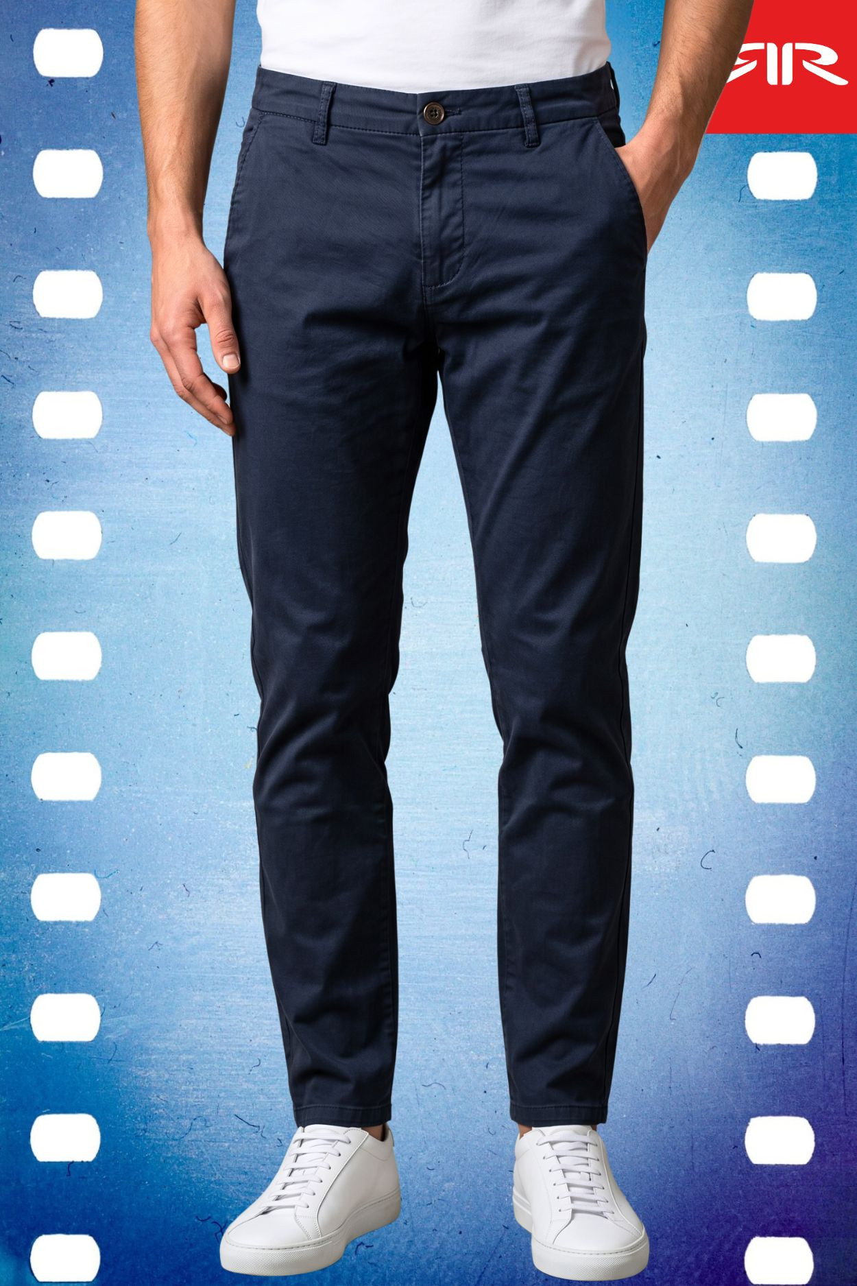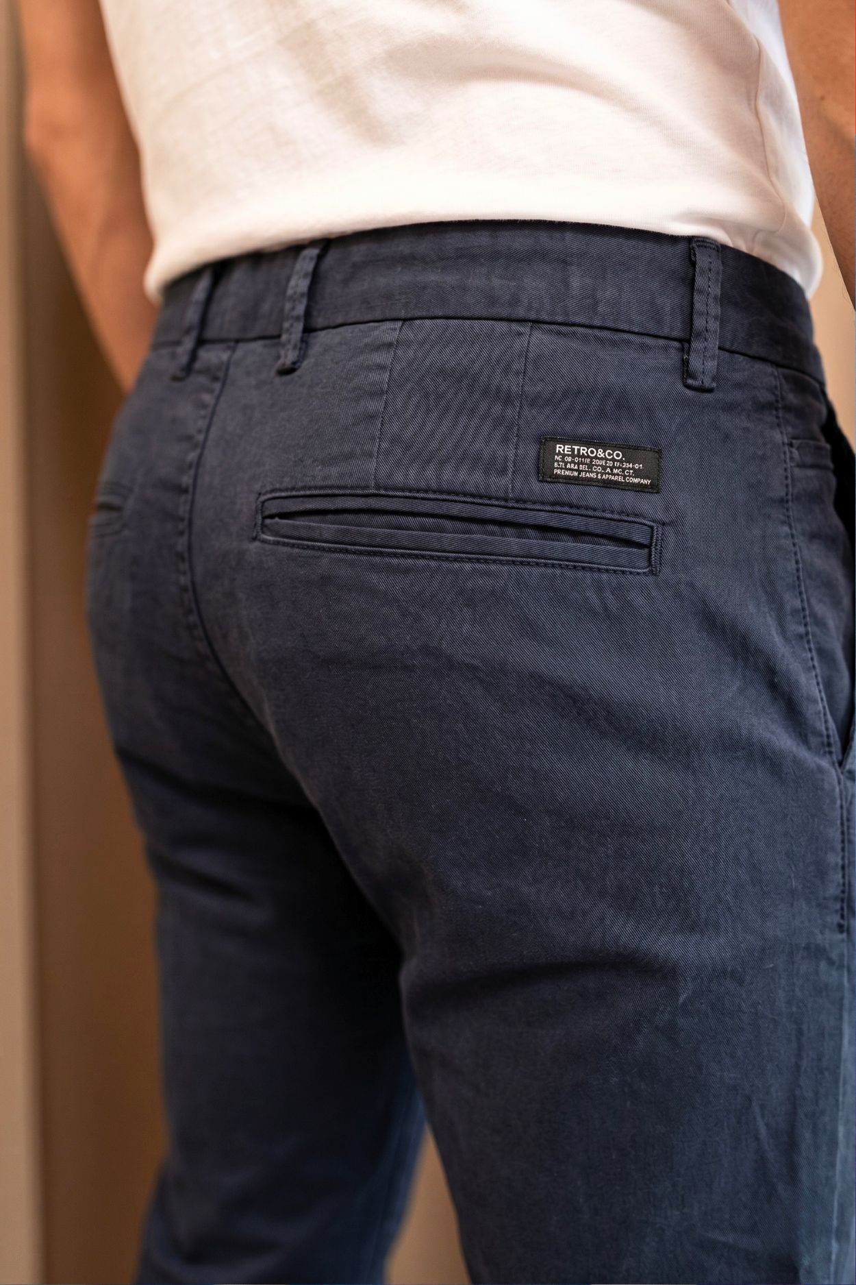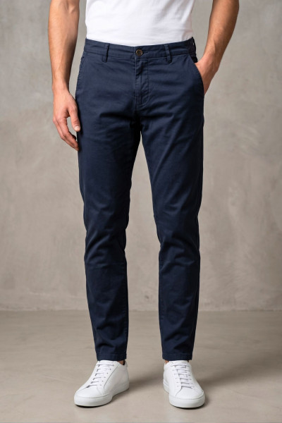 RetroJeans férfi chino nadrág, sötétkék színben; klasszikus szabással; svédzsebekkel; 2 farzsebbel, rajta rávarrt textil márkajelzéssel.