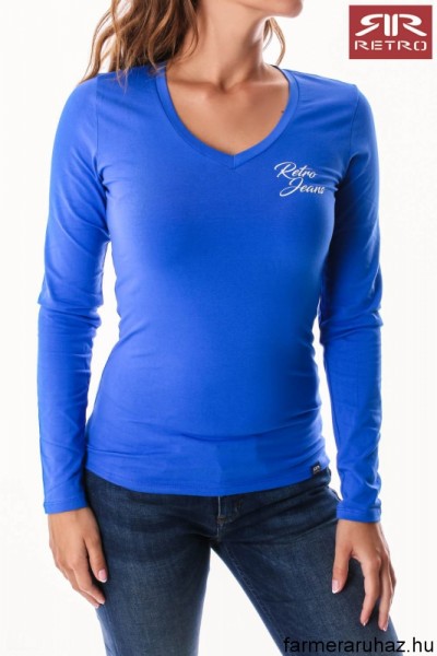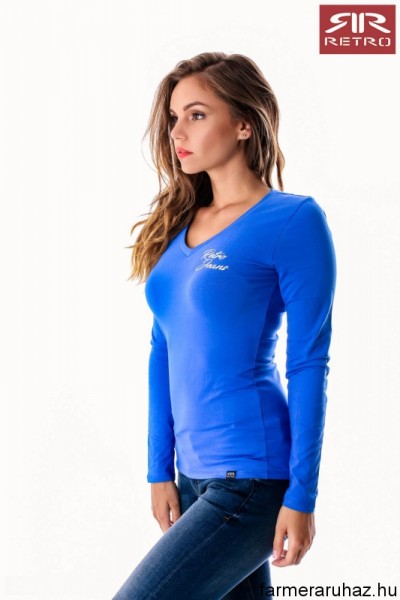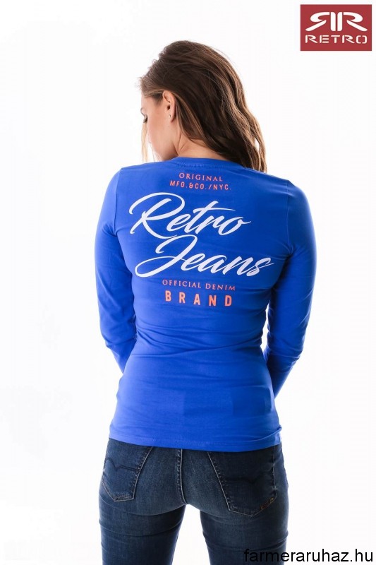 RetroJeans női hosszú ujjú felső (Rowina L.S. Top ) kék (Blue) színben, elején és hátán filmnyomott felirattal és márkajelzéssel az őszi Retro Jeans kollekcióból.