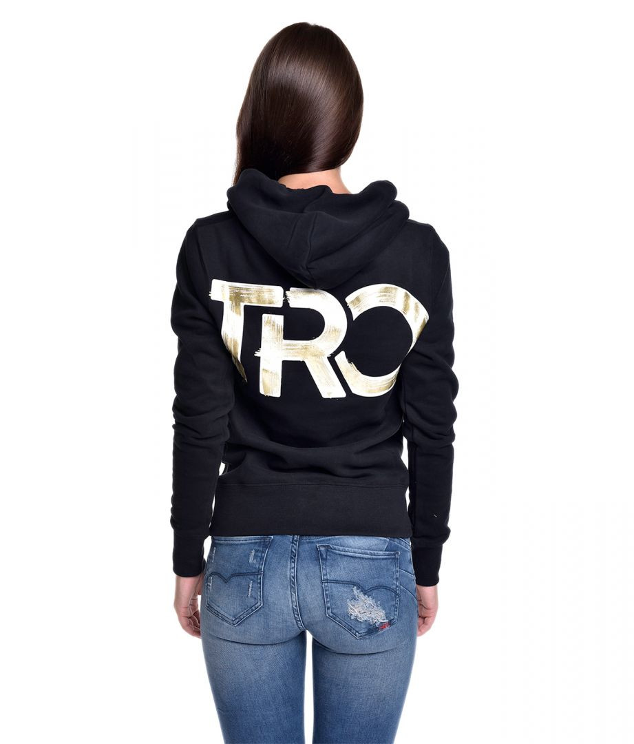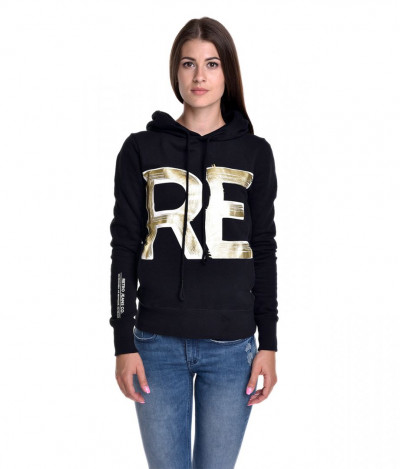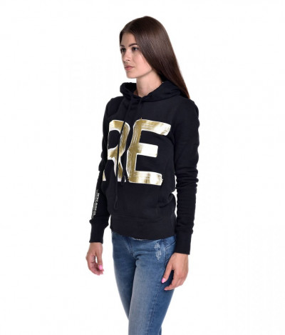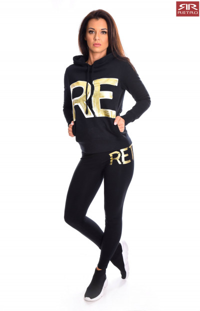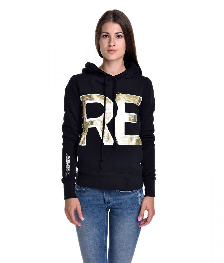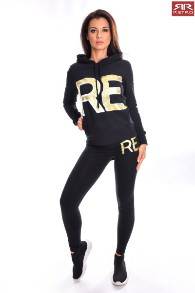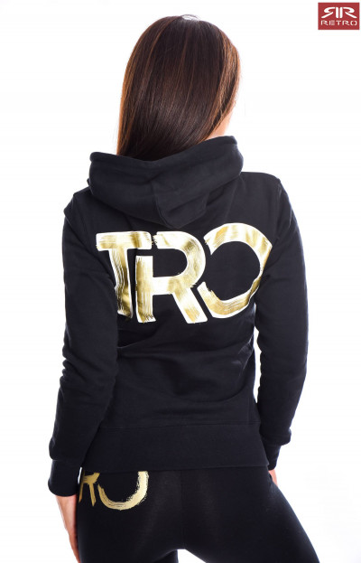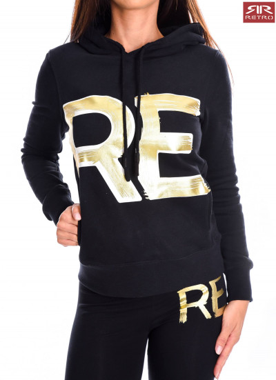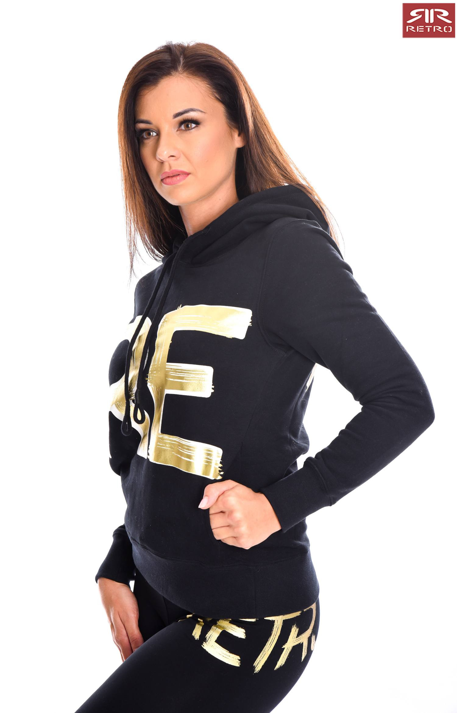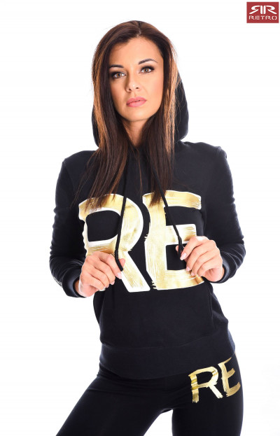 Retro Jeans női kapucnis jogging felső (Karlene Jogging Top), fekete színben, oldalzsebes, kapucnija összehúzható, ujján fekete valamint elején és hátulján körbe arany színű filmnyomott márkajelzéssel az őszi/téli Retro Jeans kollekcióból.