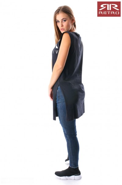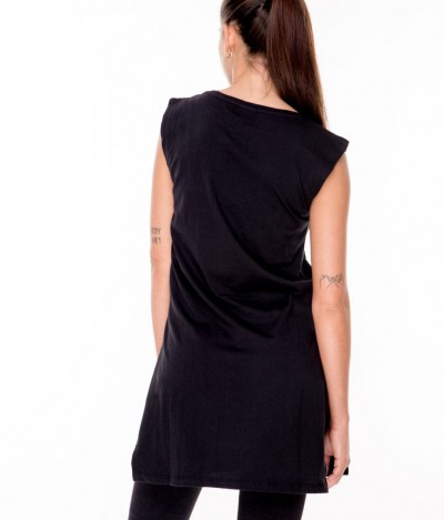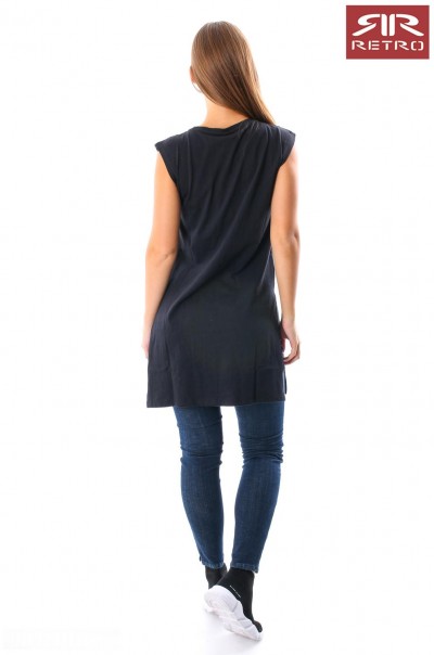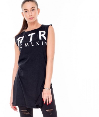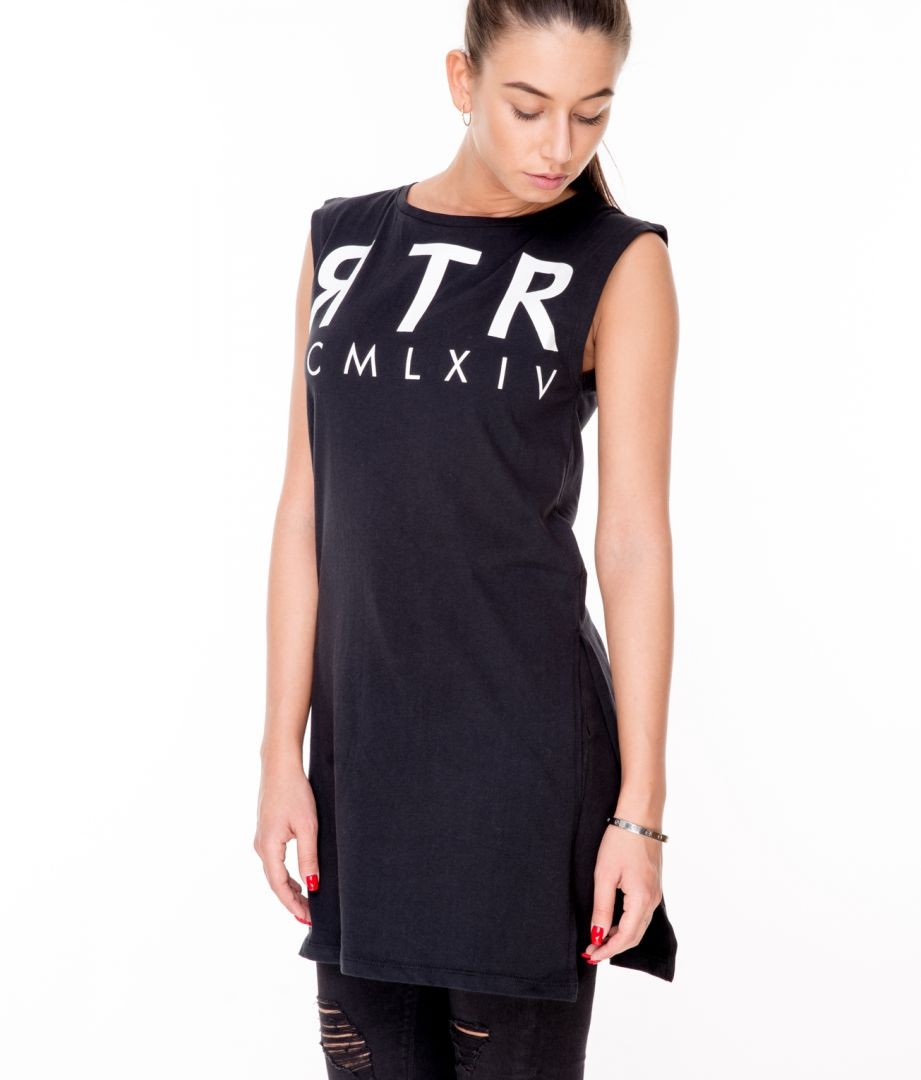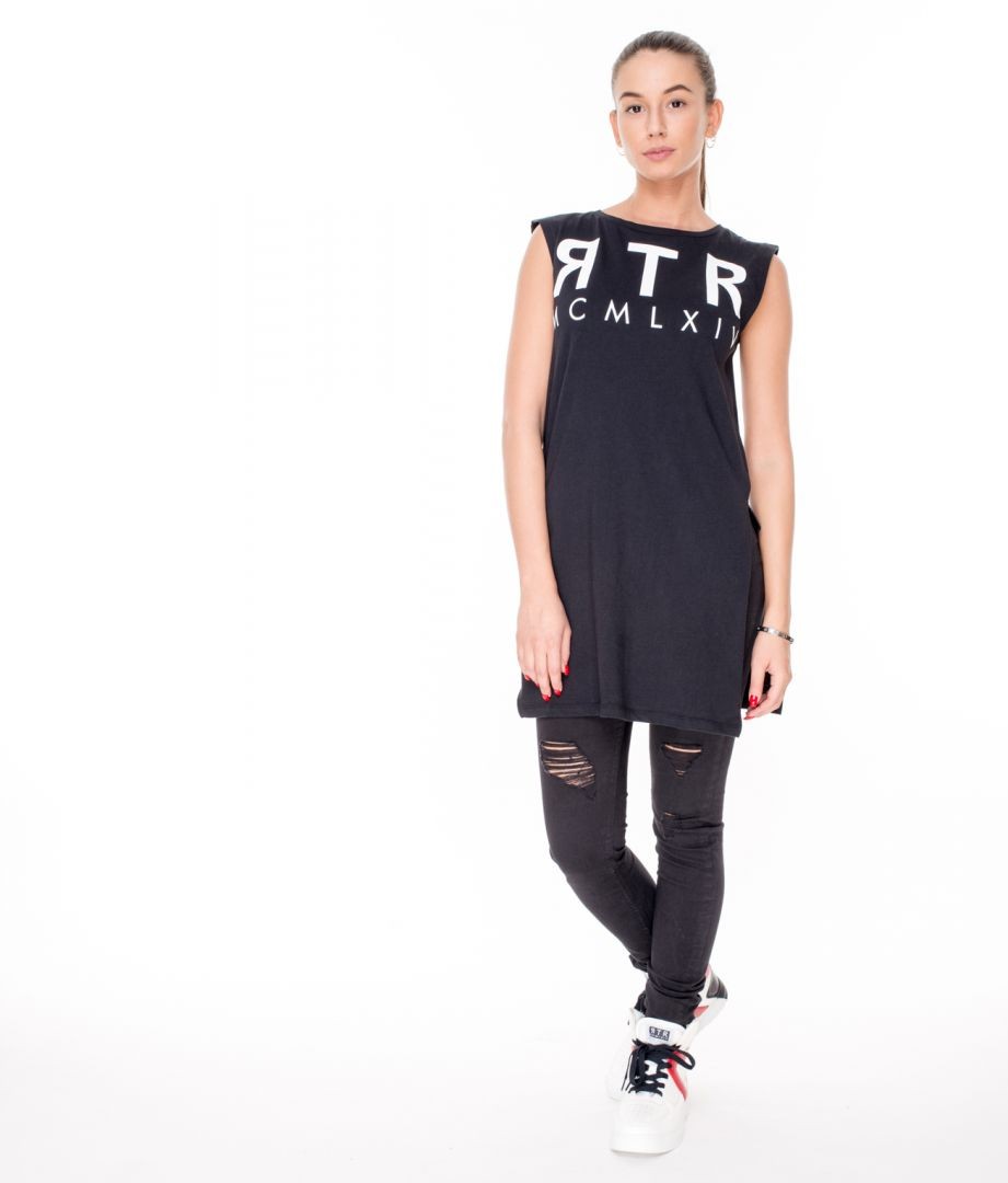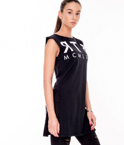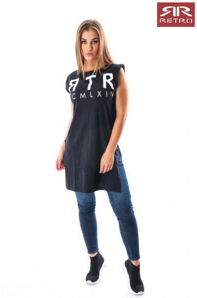 RetroJeans női ruha (Tabitha Dress), fekete (Black) színben, oldalt felsliccelt, elején nyomott márkajelzéssel az őszi Retro Jeans kollekcióból.