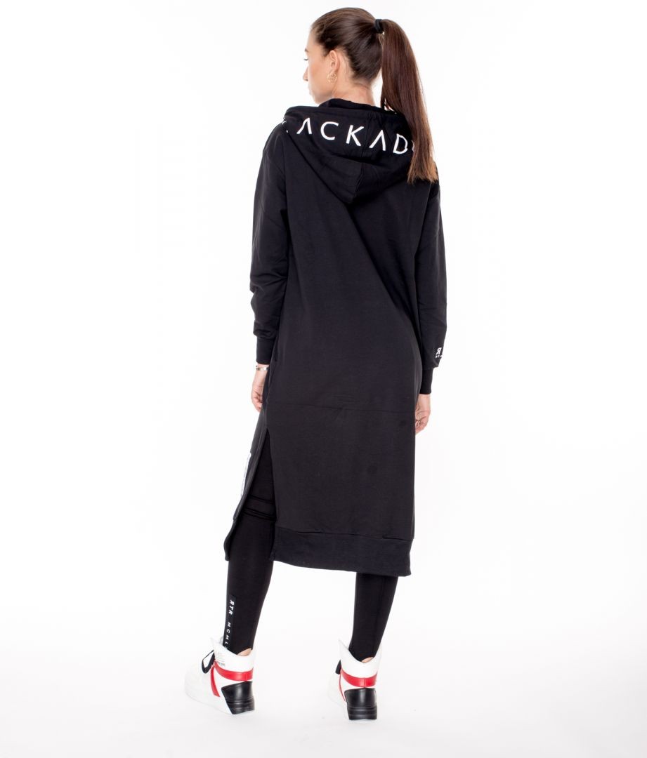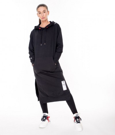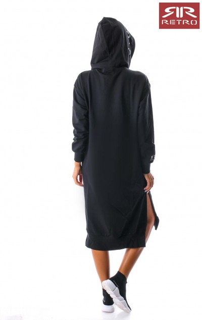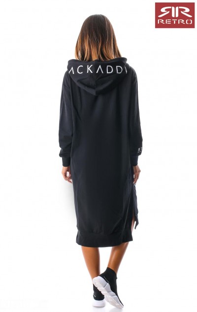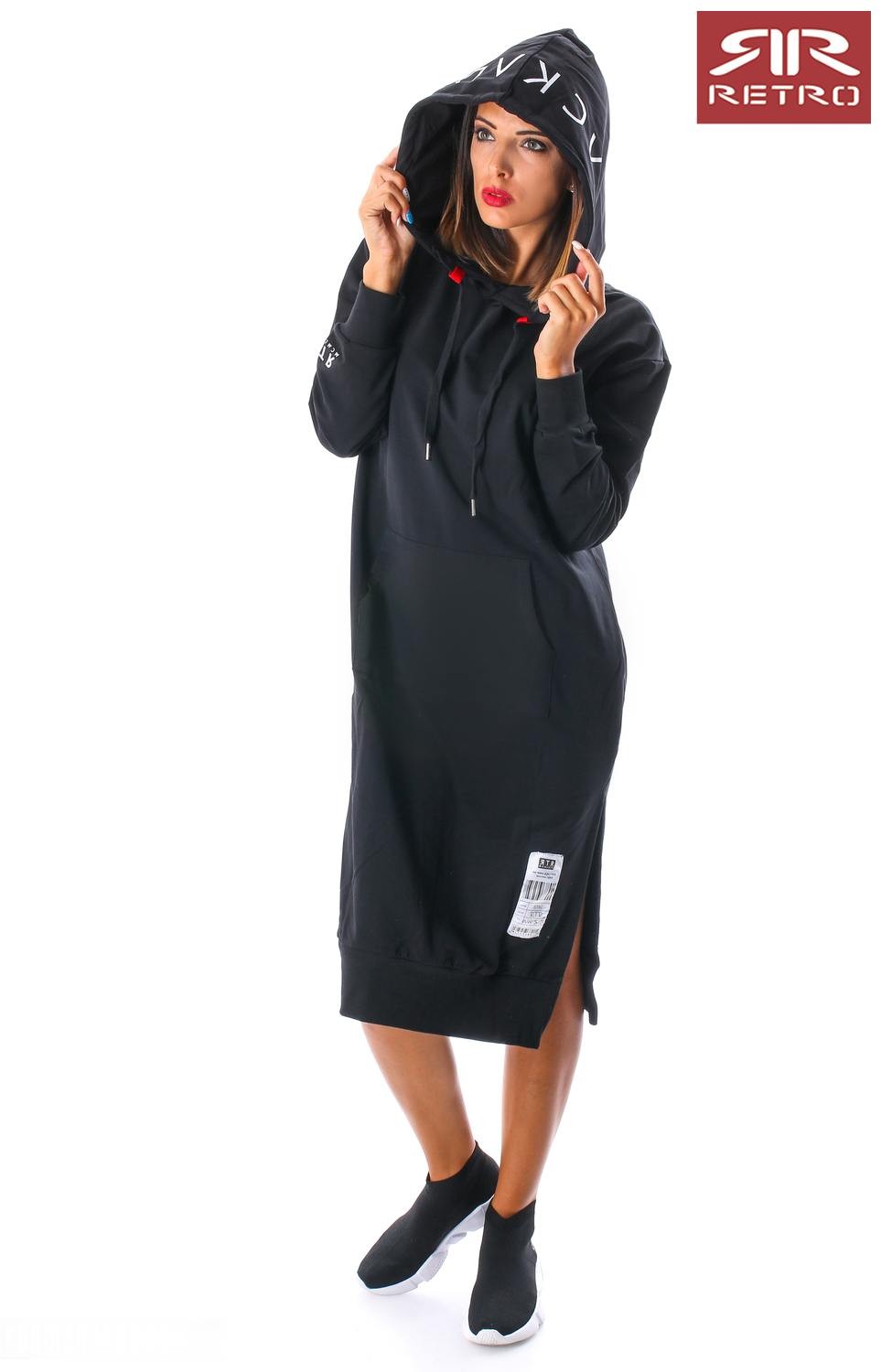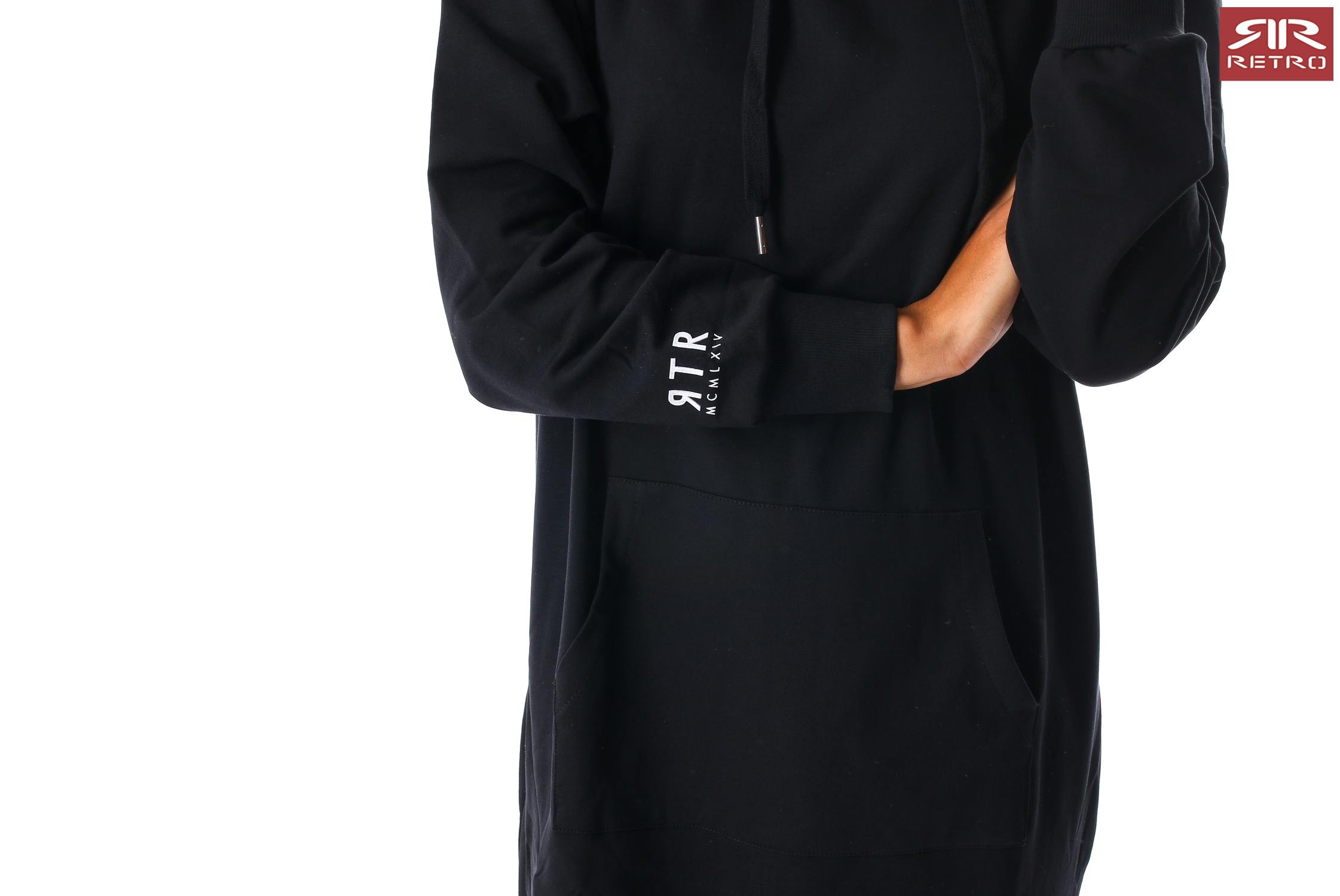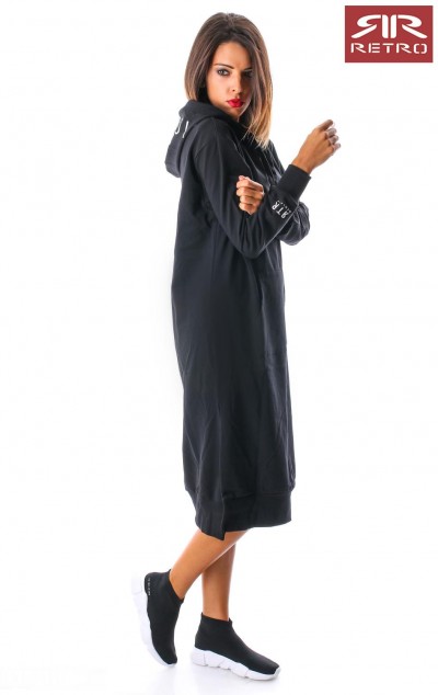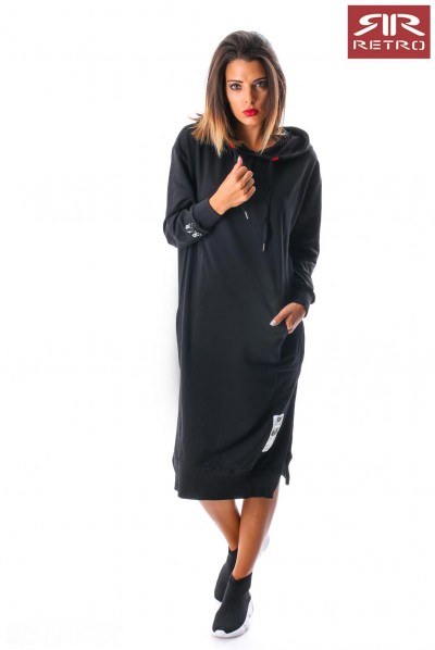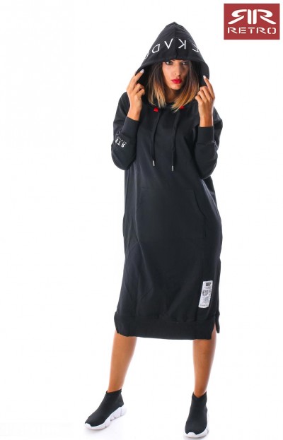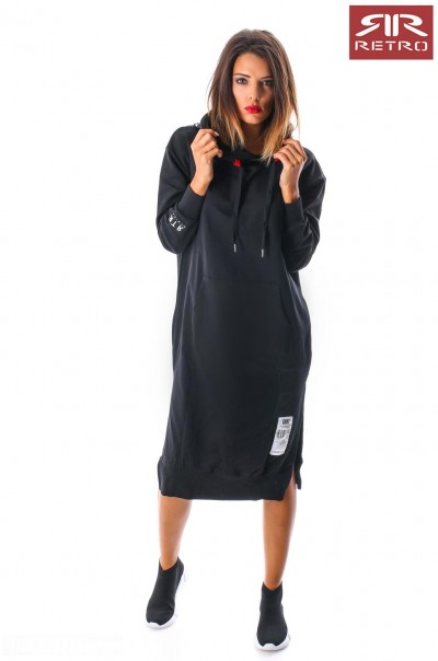 RetroJeans női ruha (Tetty Dress), fekete (Black) színben, kenguruzsebes, kapucniján filmnyomott felirattal, elején varrott- ujján nyomott márkajelzéssel az őszi Retro Jeans kollekcióból.